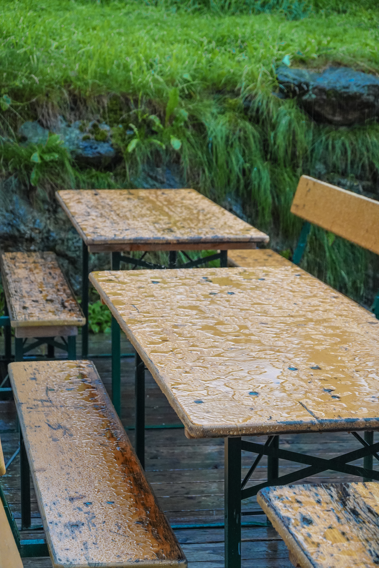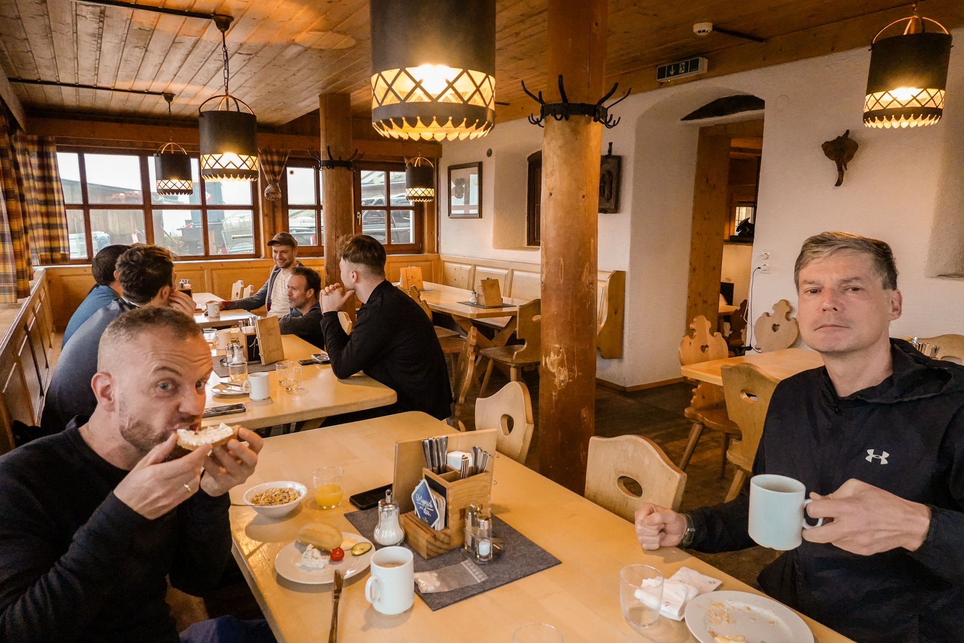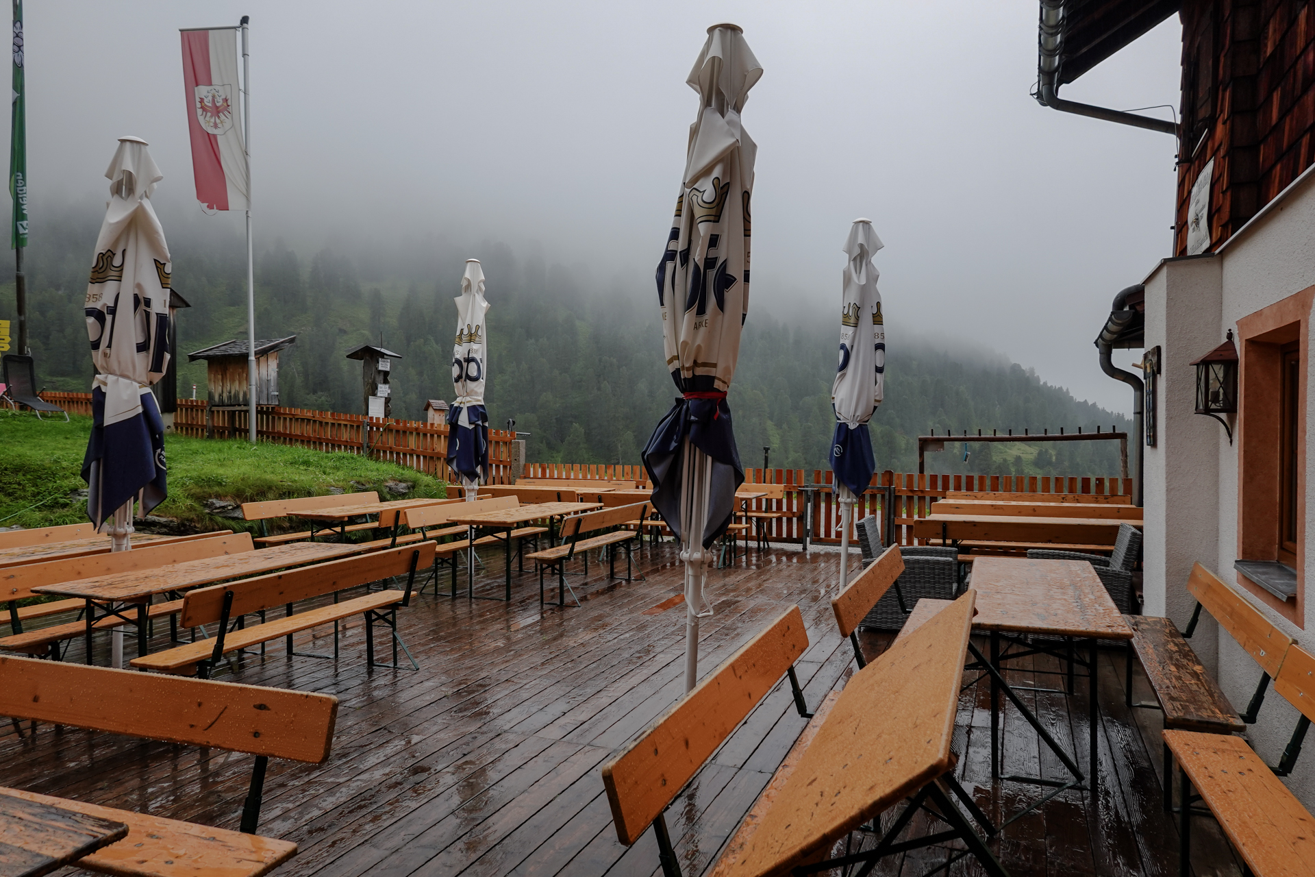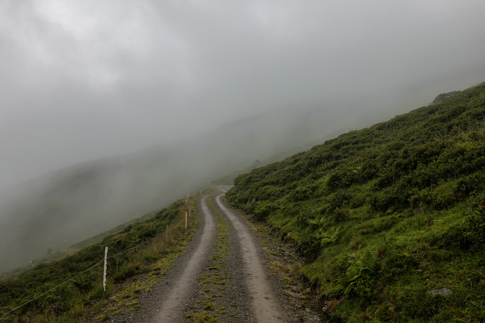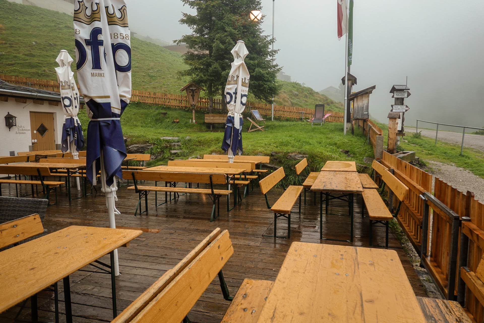 Der Wecker klingelt um 7:00 Uhr. Noch vor dem Frühstück werfen wir einen ersten Blick aus dem Fenster: Dichtester Nebel liegt über der Landschaft, begleitet von starkem Regen – die Sichtweite ist nahezu null. Wir gönnen uns ein ausgiebiges, energiereiches Frühstück und freuen uns trotz des Wetters auf einen tollen Tag – die Hoffnung stirbt zuletzt.. Wir bezahlen, packen unsere Rucksäcke und machen uns bei kühlen 6 Grad auf den Weg.