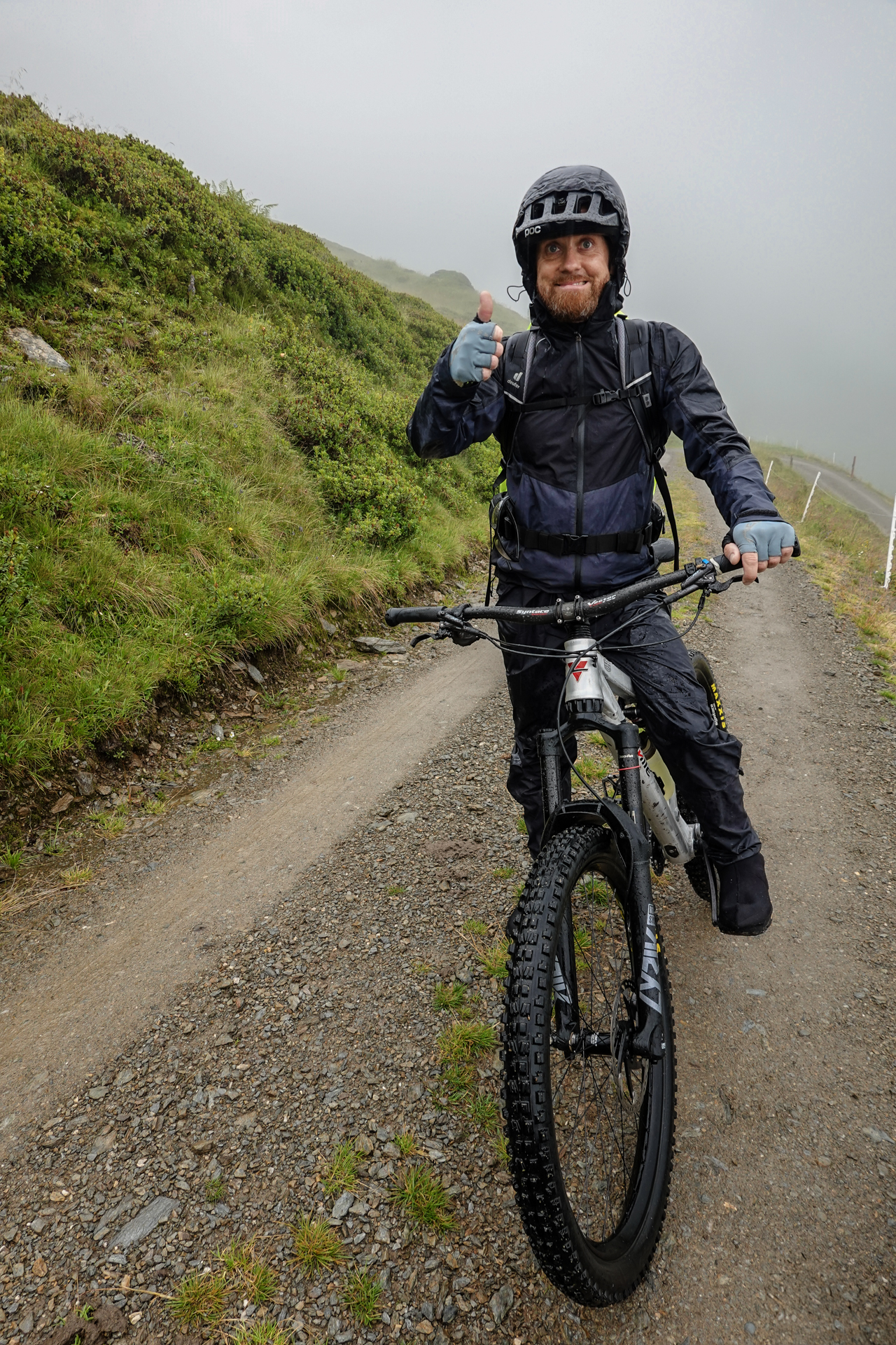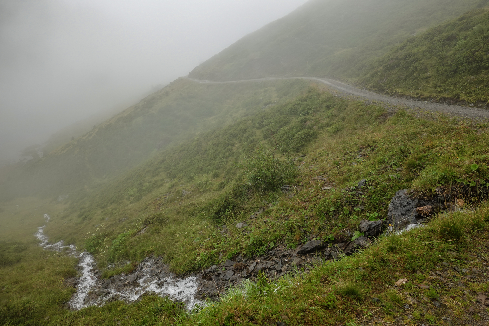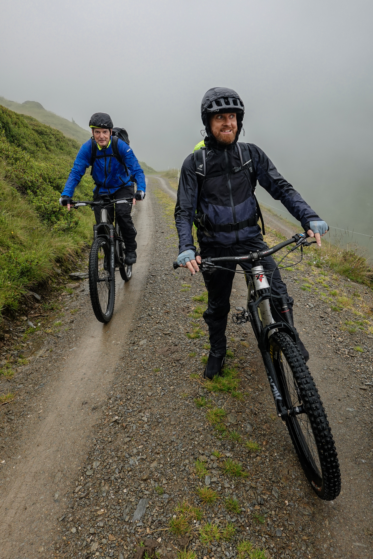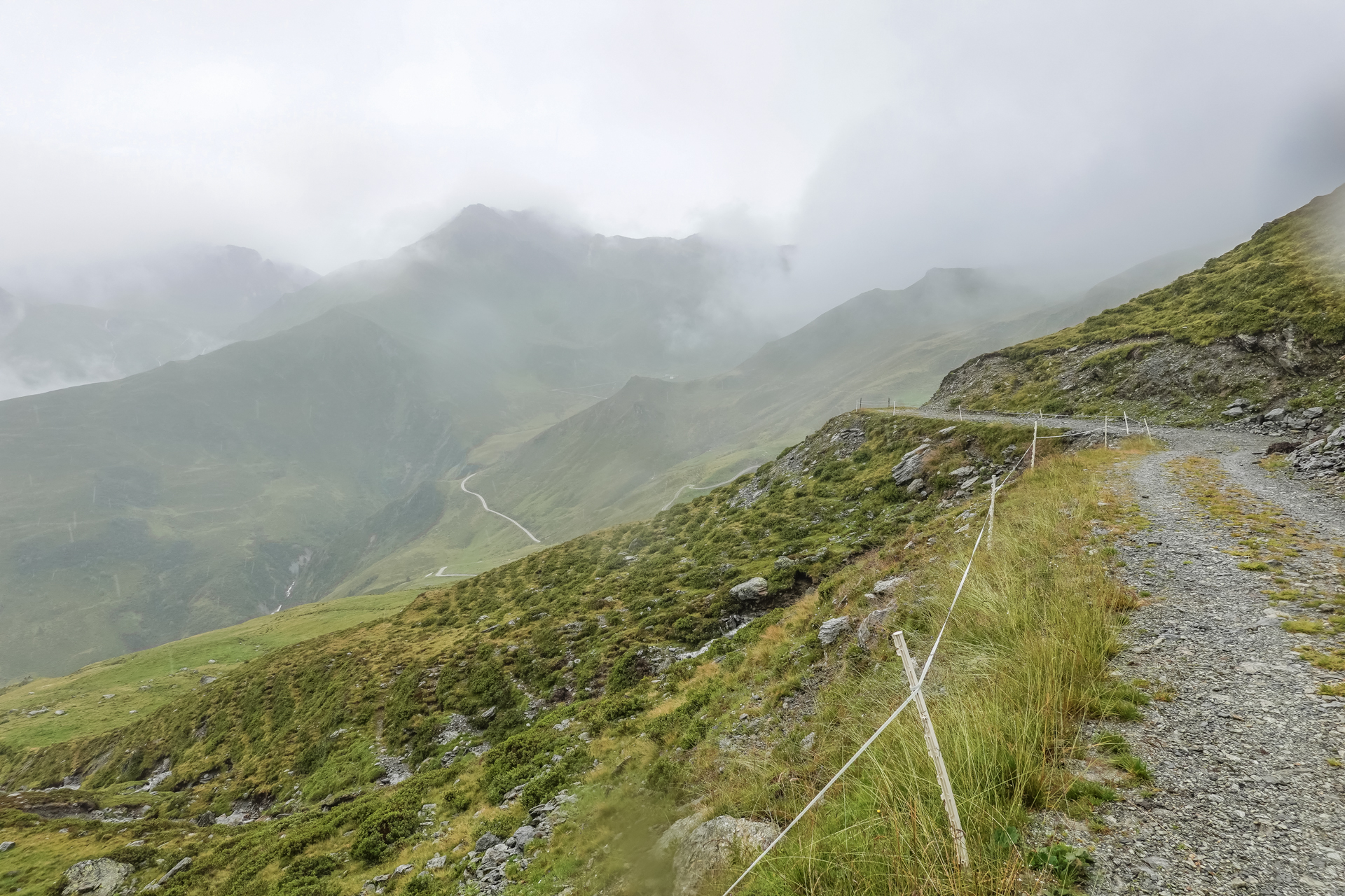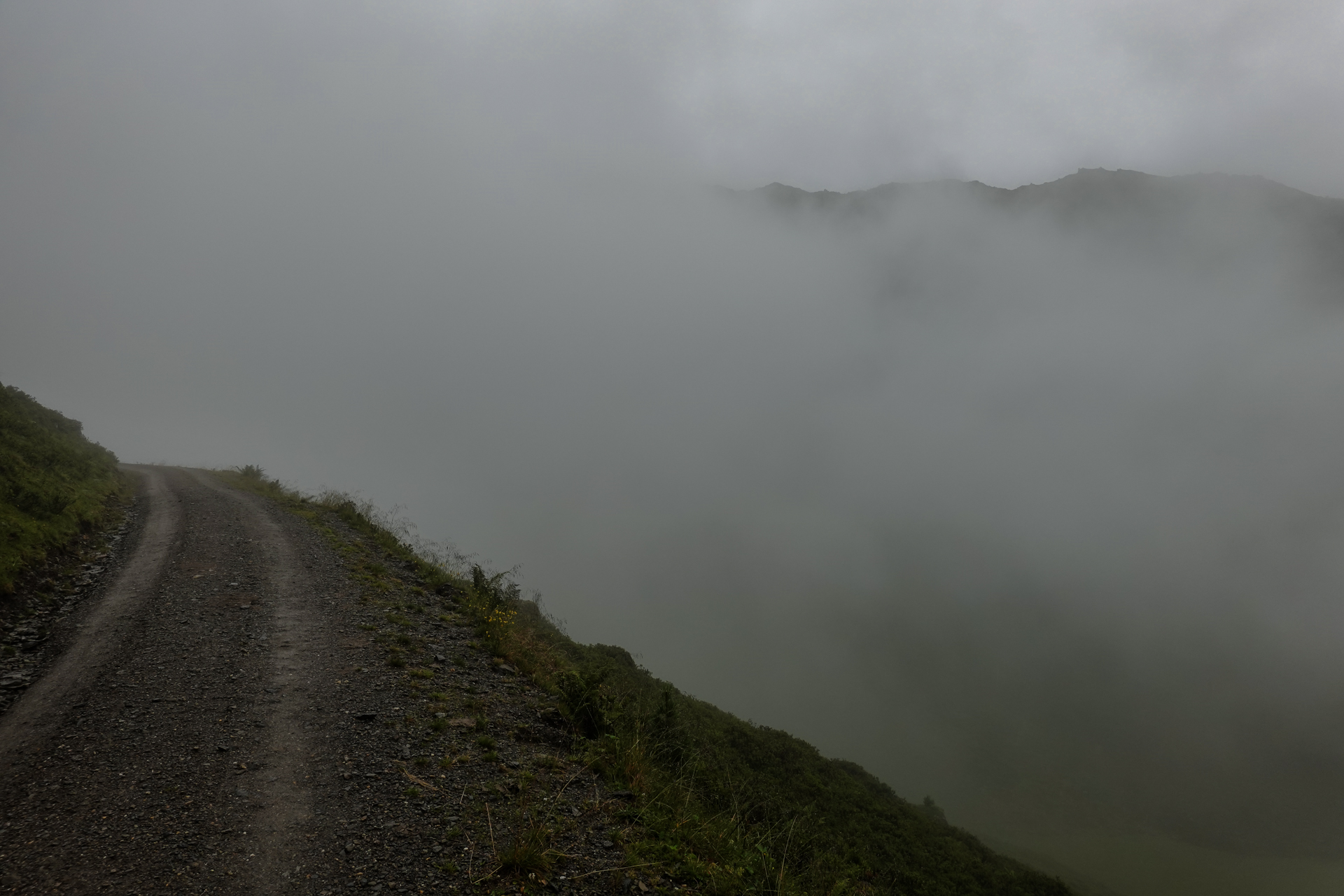 Oben angekommen, ist es mit nur 3 Grad sehr kalt und der Wind pfeift uns um die Ohren. Der Nieselregen lässt die Bedingungen ungemütlich erscheinen, doch wir sind froh, den ersten großen Übergang geschafft zu haben. Die Abfahrt erfolgt auf einem serpentinenreichen Schotterweg, der sich in engen Kurven ins Tal schlängelt. Anfangs umfährt man noch die großen Pfützen, irgendwann ist einem das egal und man fährt mitten durch – demensprechend sehen wir auch aus! Aufgrund des Nebels bleibt die beeindruckende Kulisse meist verborgen – lediglich schemenhaft lassen sich die Berge erahnen. Dennoch beginnt der Himmel sich langsam zu lichten.