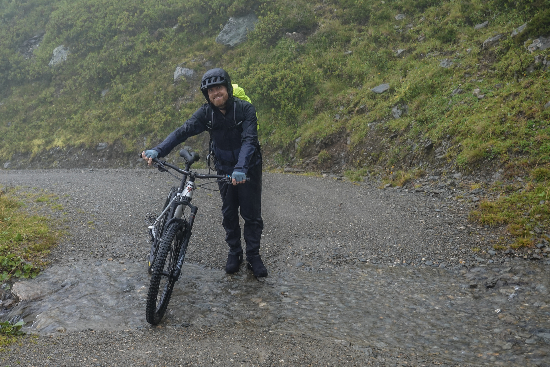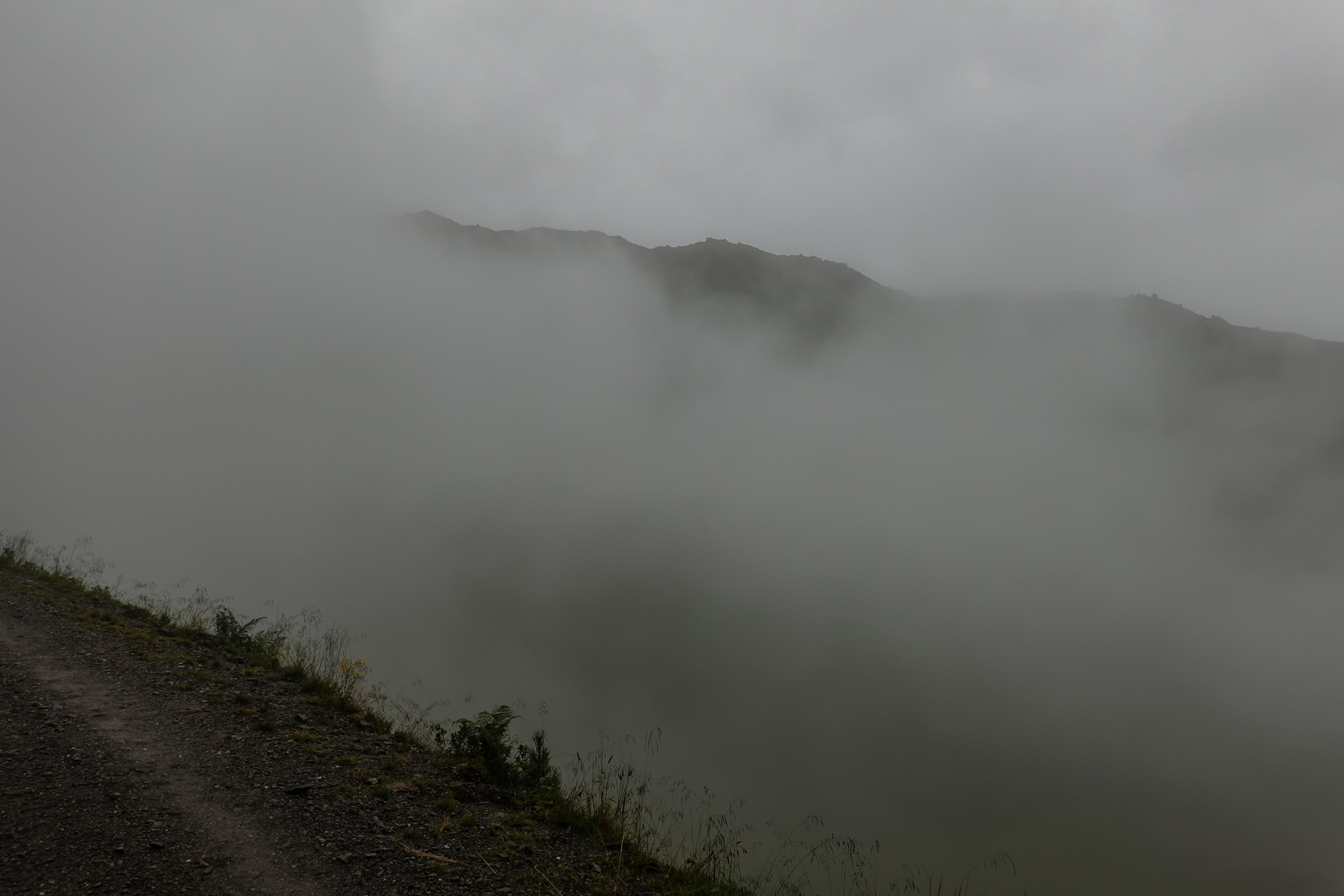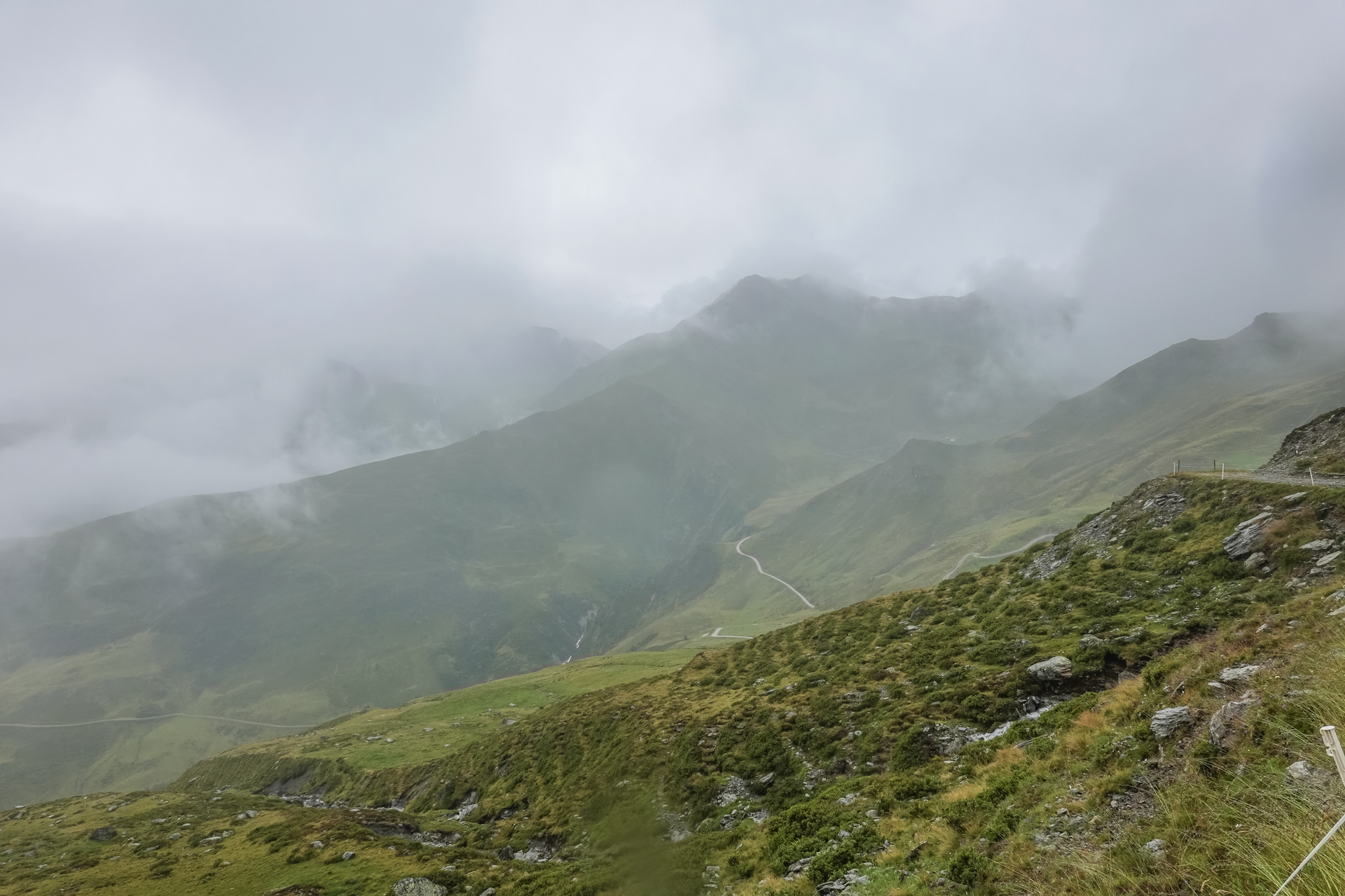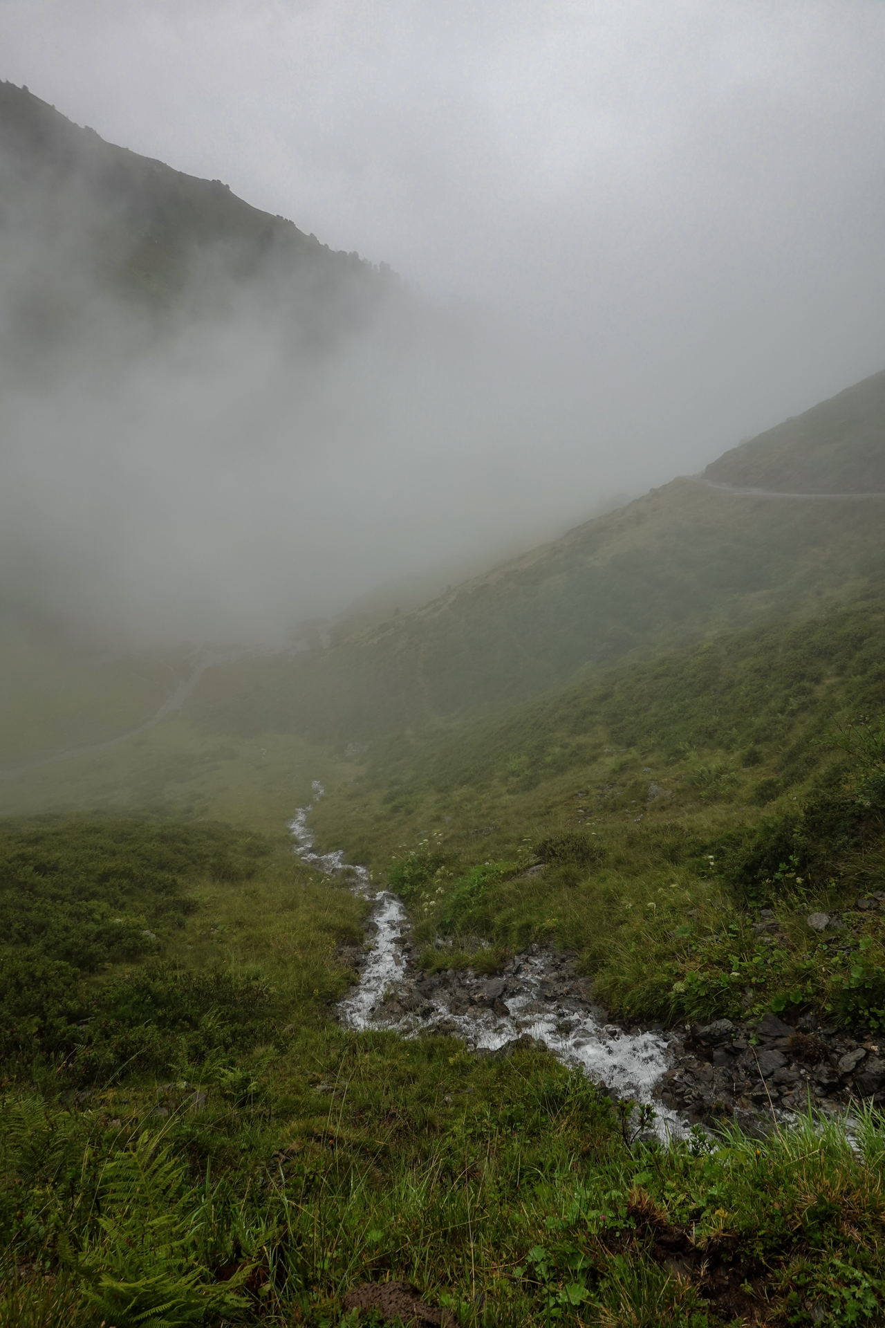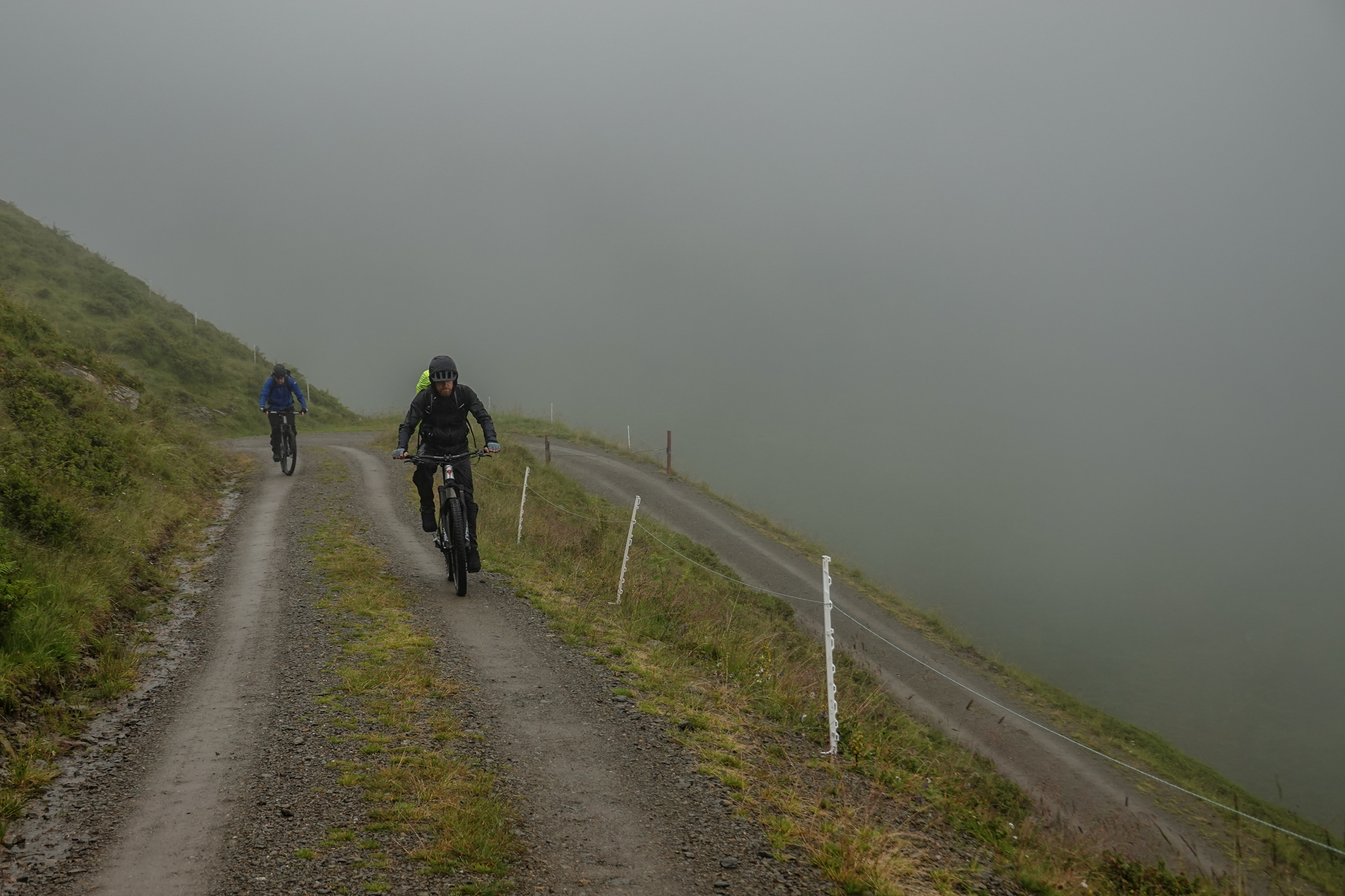 Oben angekommen, ist es mit nur 3 Grad sehr kalt und der Wind pfeift uns um die Ohren. Der Nieselregen lässt die Bedingungen ungemütlich erscheinen, doch wir sind froh, den ersten großen Übergang geschafft zu haben. Die Abfahrt erfolgt auf einem serpentinenreichen Schotterweg, der sich in engen Kurven ins Tal schlängelt. Anfangs umfährt man noch die großen Pfützen, irgendwann ist einem das egal und man fährt mitten durch – demensprechend sehen wir auch aus! Aufgrund des Nebels bleibt die beeindruckende Kulisse meist verborgen – lediglich schemenhaft lassen sich die Berge erahnen. Dennoch beginnt der Himmel sich langsam zu lichten.