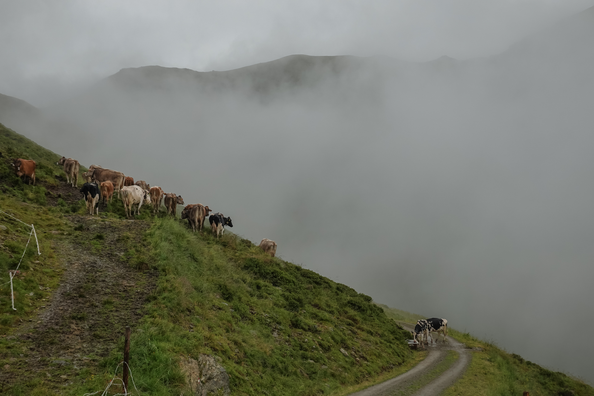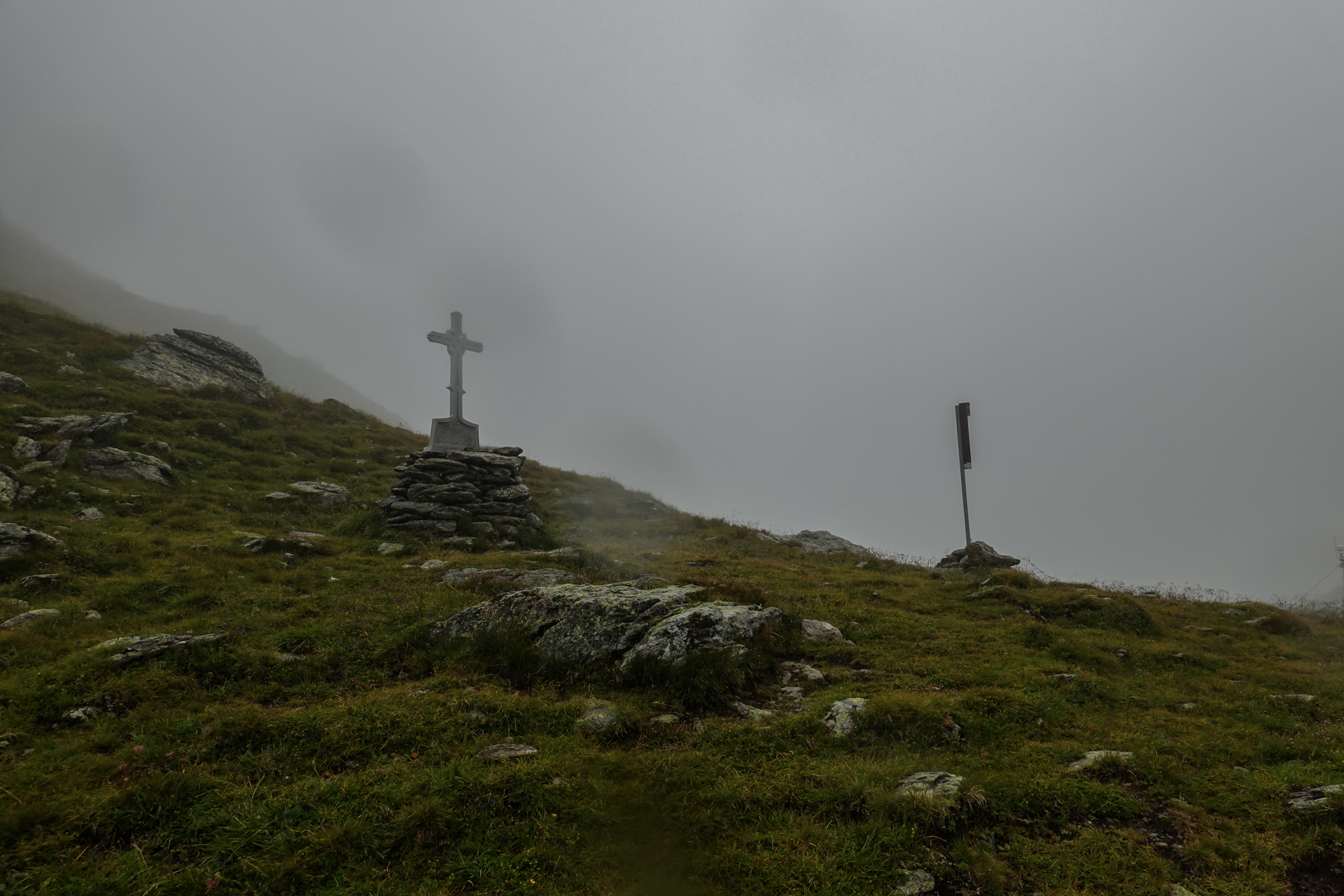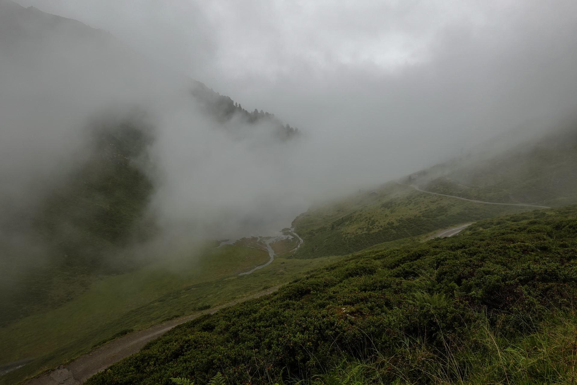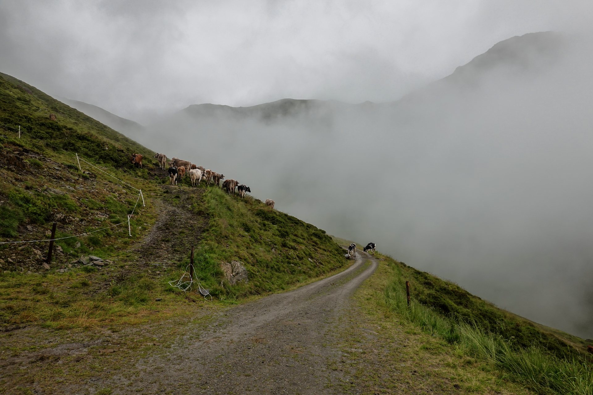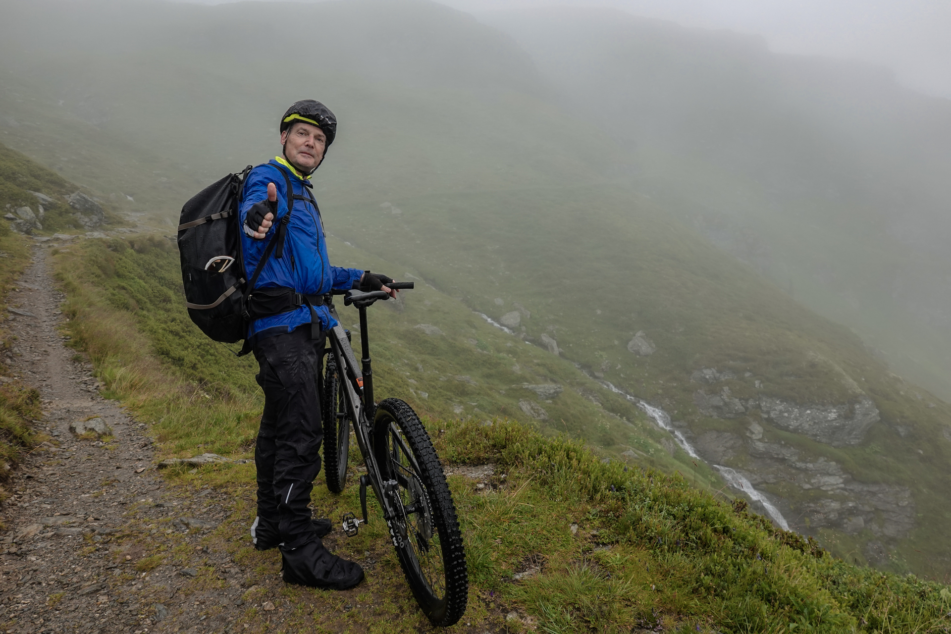 Oben angekommen, ist es mit nur 3 Grad sehr kalt und der Wind pfeift uns um die Ohren. Der Nieselregen lässt die Bedingungen ungemütlich erscheinen, doch wir sind froh, den ersten großen Übergang geschafft zu haben. Die Abfahrt erfolgt auf einem serpentinenreichen Schotterweg, der sich in engen Kurven ins Tal schlängelt. Anfangs umfährt man noch die großen Pfützen, irgendwann ist einem das egal und man fährt mitten durch – demensprechend sehen wir auch aus! Aufgrund des Nebels bleibt die beeindruckende Kulisse meist verborgen – lediglich schemenhaft lassen sich die Berge erahnen. Dennoch beginnt der Himmel sich langsam zu lichten.