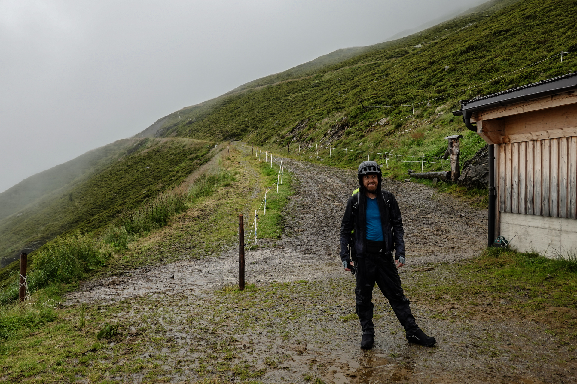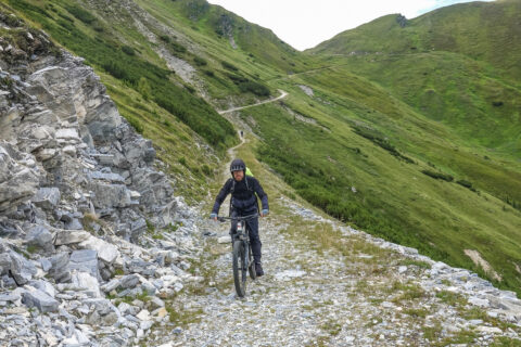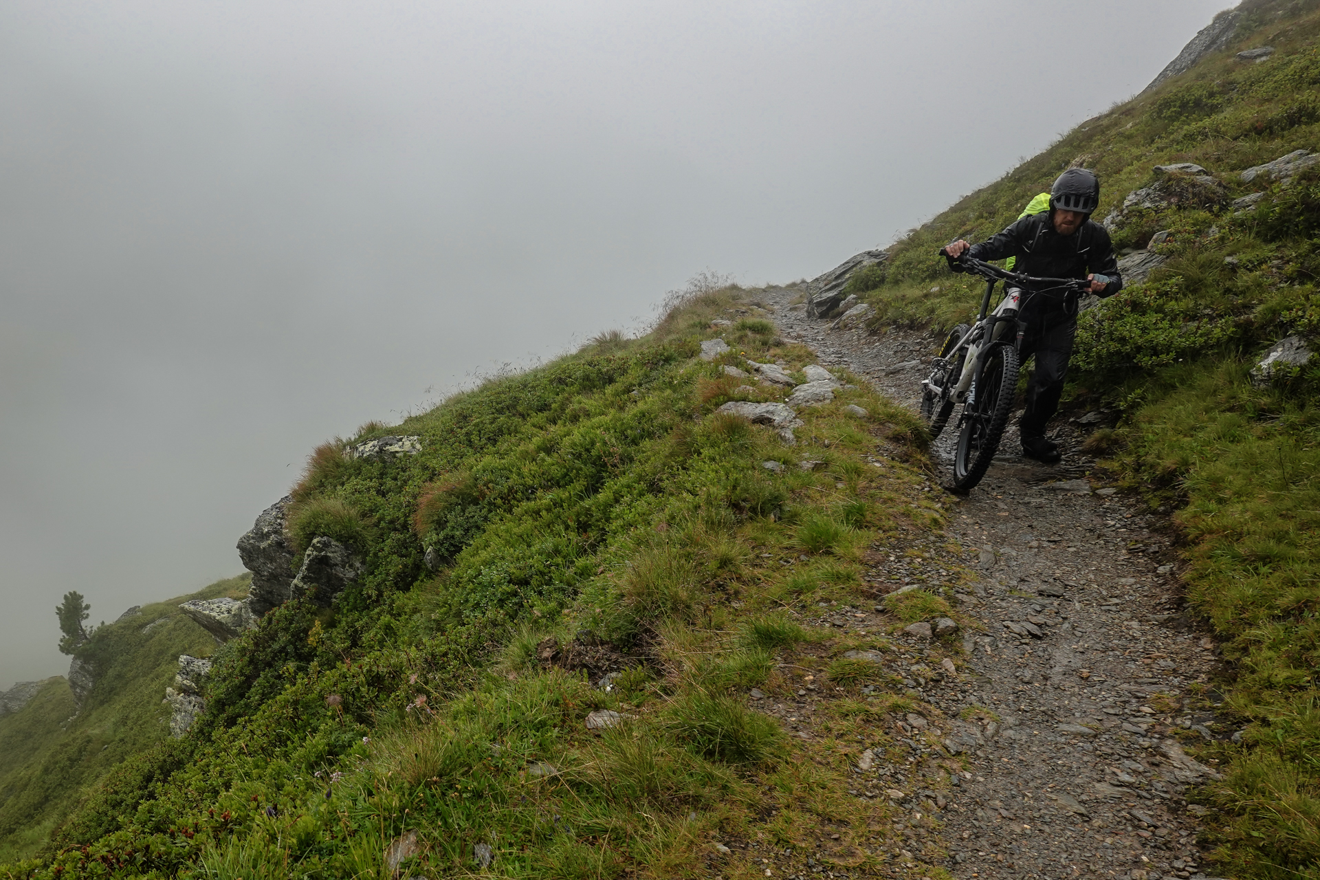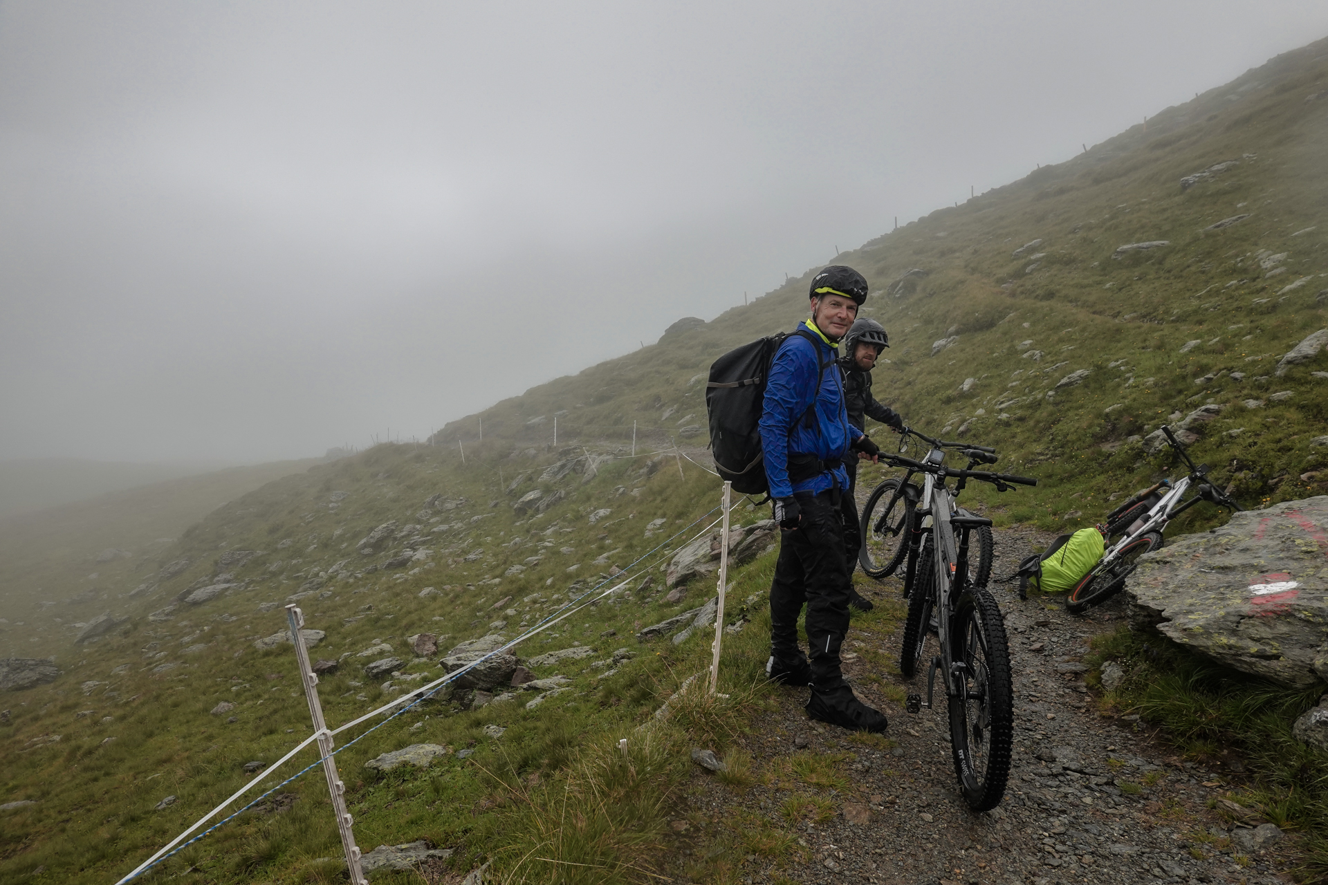 Direkt hinter der Hütte beginnt der Aufstieg. Der Weg ist durch den anhaltenden Regen stark aufgeweicht, matschig und stellenweise sehr steil. Zu Beginn ist Fahren auf dem Shotteeweg zwar anstrengend, aber dennoch trotz der Steilheit möglich. Der Weg wird schmäler und etwas ausgesetzter – wir müssen das Bike größtenteils schieben. Ein Hinweisschild bestätigt dies: „Mountainbike-Schiebestrecke“. Wir halten uns daran – fahren wäre ohnehin kaum möglich. Der Weg wird immer schmaler, verwandelt sich zunehmend in einen Trail, der uns schließlich hinauf zum Geiseljoch auf 2.290 Metern führt. Die Strecke bis zum Joch misst rund 4 Kilometer mit 470 Höhenmetern – eine anstrengende Passage.