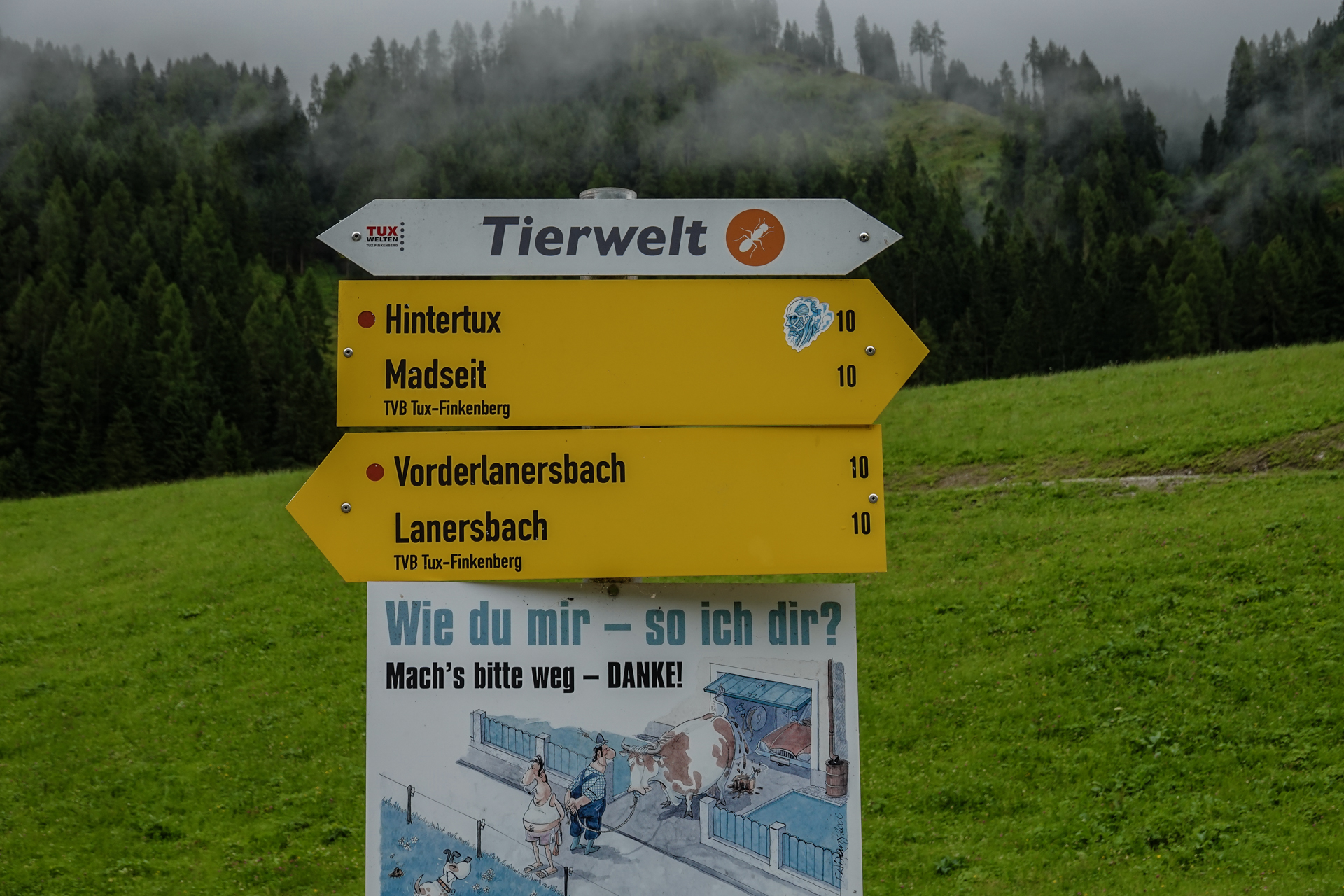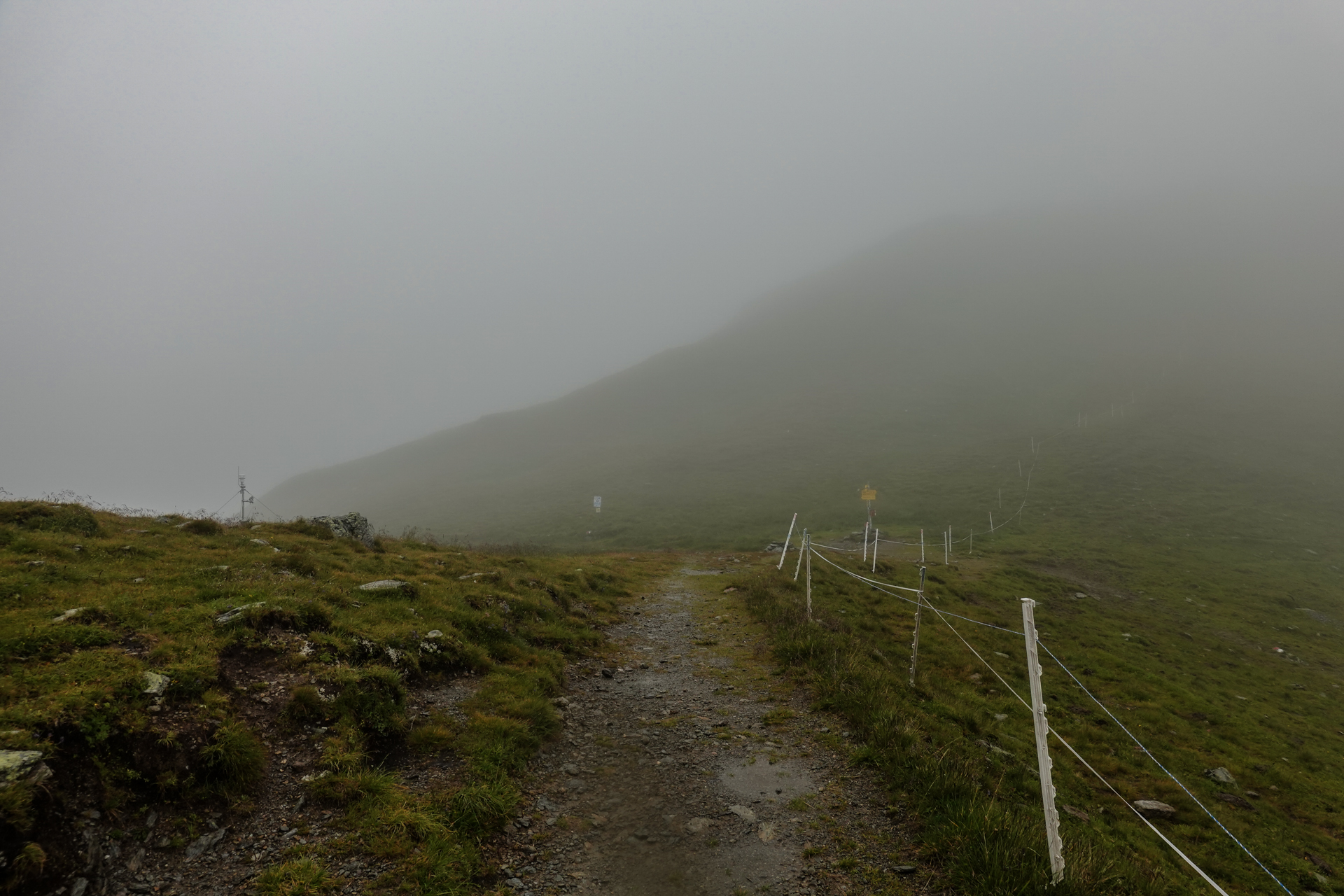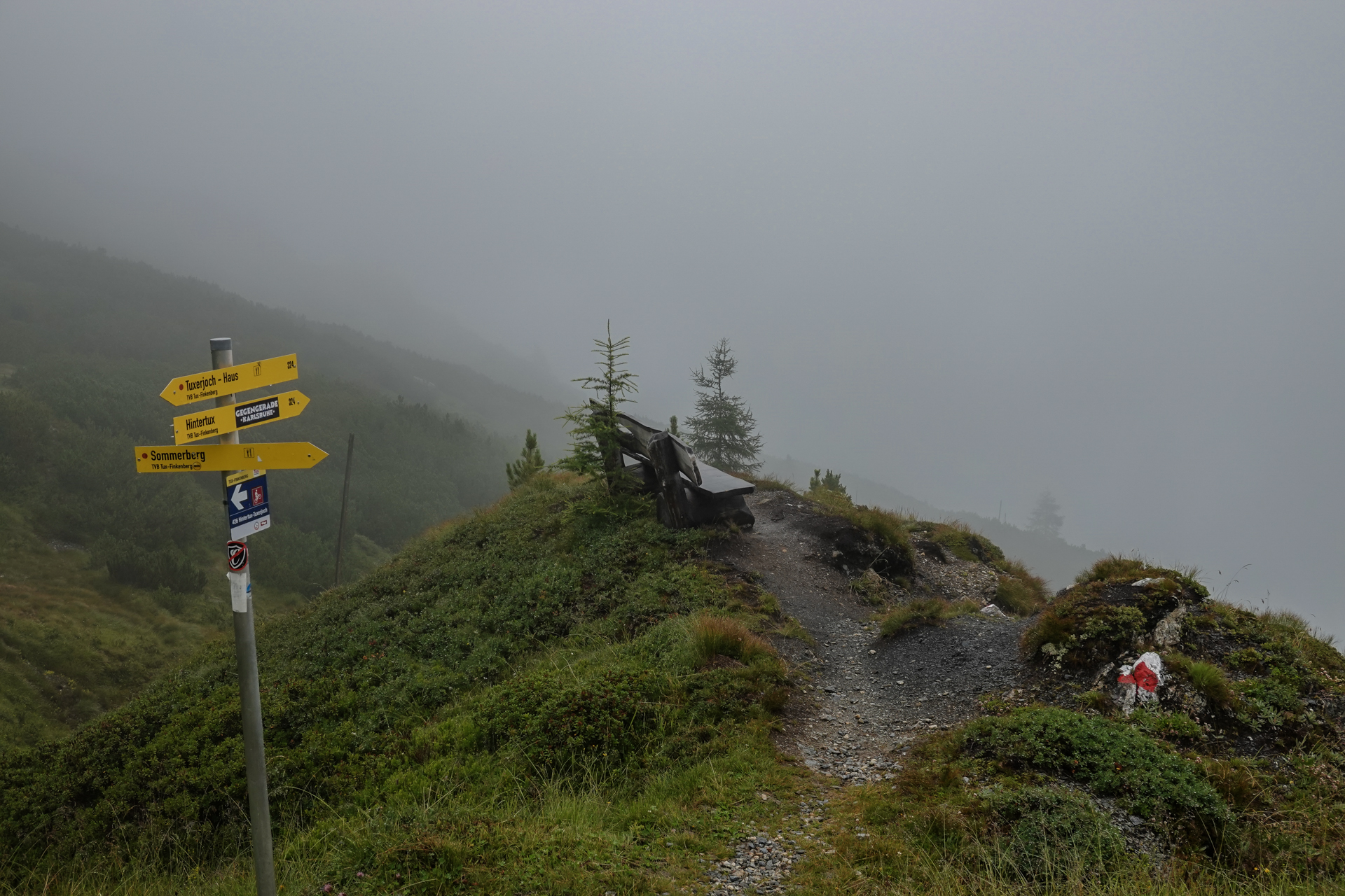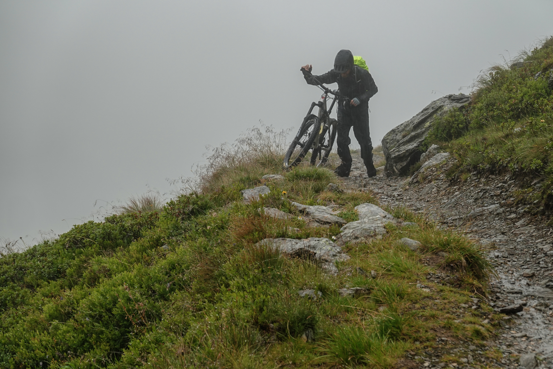 Direkt hinter der Hütte beginnt der Aufstieg. Der Weg ist durch den anhaltenden Regen stark aufgeweicht, matschig und stellenweise sehr steil. Zu Beginn ist Fahren auf dem Shotteeweg zwar anstrengend, aber dennoch trotz der Steilheit möglich. Der Weg wird schmäler und etwas ausgesetzter – wir müssen das Bike größtenteils schieben. Ein Hinweisschild bestätigt dies: „Mountainbike-Schiebestrecke“. Wir halten uns daran – fahren wäre ohnehin kaum möglich. Der Weg wird immer schmaler, verwandelt sich zunehmend in einen Trail, der uns schließlich hinauf zum Geiseljoch auf 2.290 Metern führt. Die Strecke bis zum Joch misst rund 4 Kilometer mit 470 Höhenmetern – eine anstrengende Passage.