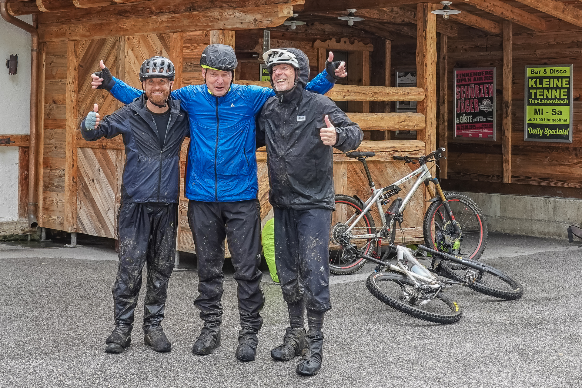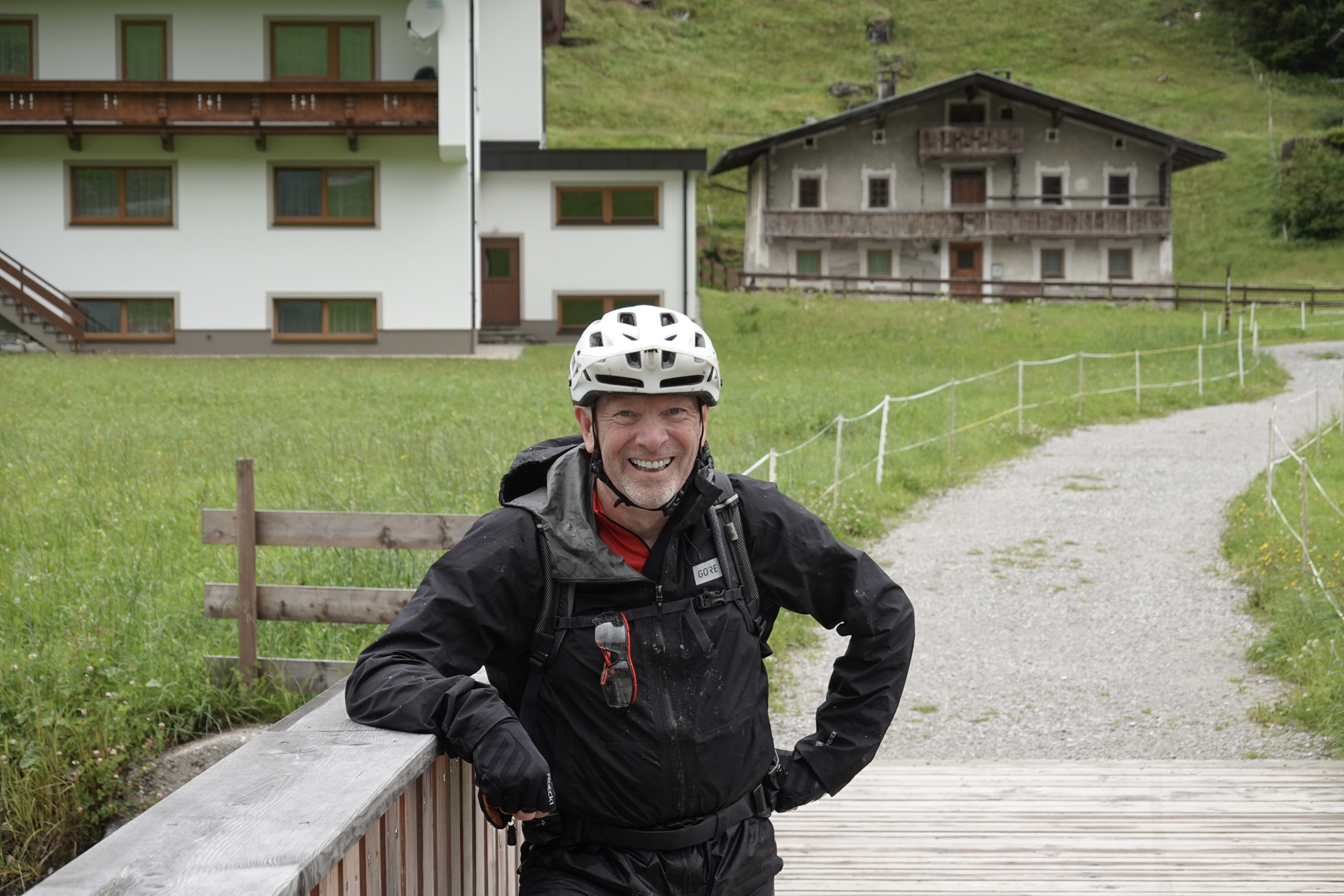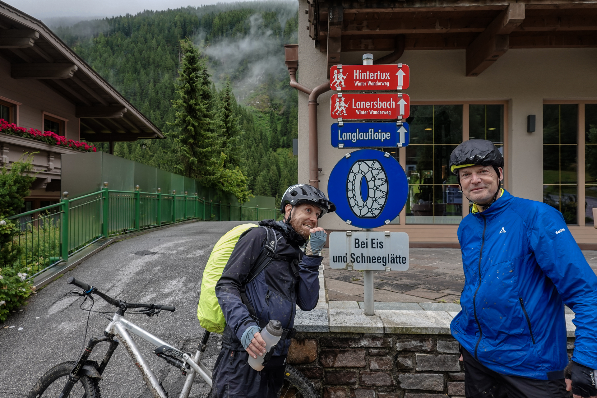 Nach einigen Kilometern folgt ein landschaftlich reizvoller Wiesentrail, der uns weiter bergab ins Tal führt. Das Wetter bessert sich zusehends, stellenweise zeigt sich die Sonne. In Tux angekommen, ziehen wir die Regenkleidung aus – endlich trockene Bedingungen. Entlang des Tuxbachs fahren wir auf einem angenehmen, leicht welligen Weg weiter bis nach Hintertux.
