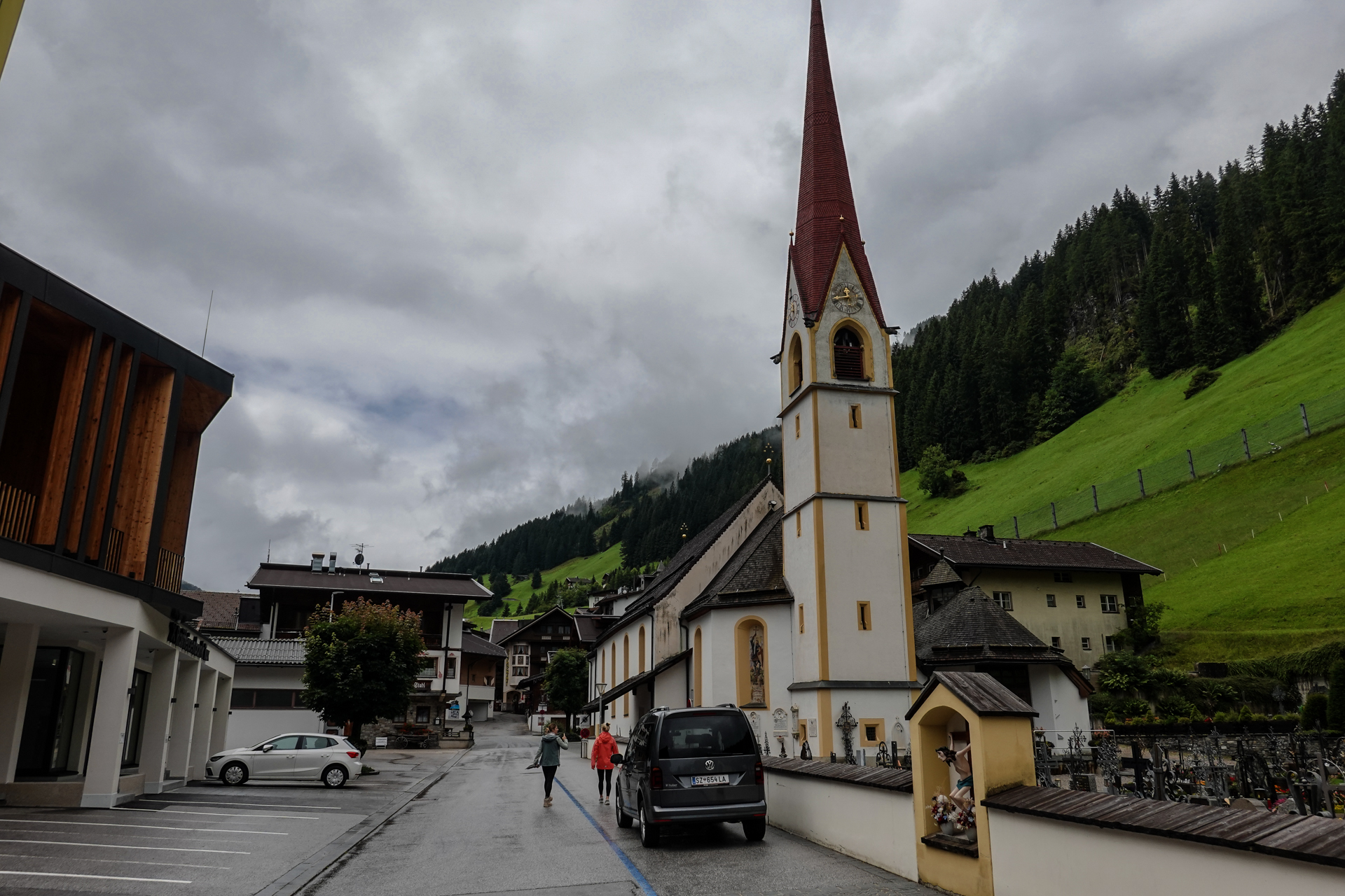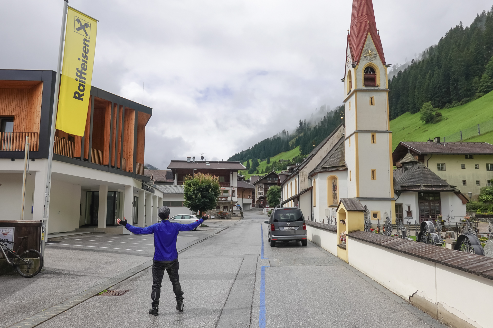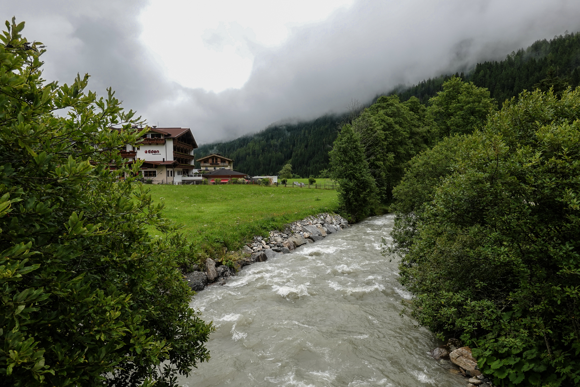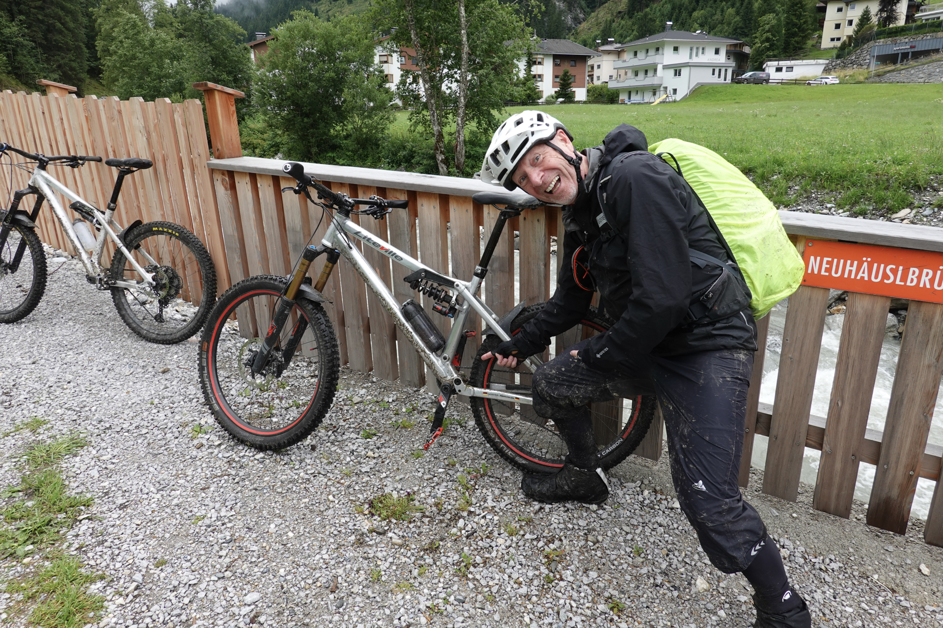 Nach einigen Kilometern folgt ein landschaftlich reizvoller Wiesentrail, der uns weiter bergab ins Tal führt. Das Wetter bessert sich zusehends, stellenweise zeigt sich die Sonne. In Tux angekommen, ziehen wir die Regenkleidung aus – endlich trockene Bedingungen. Entlang des Tuxbachs fahren wir auf einem angenehmen, leicht welligen Weg weiter bis nach Hintertux.