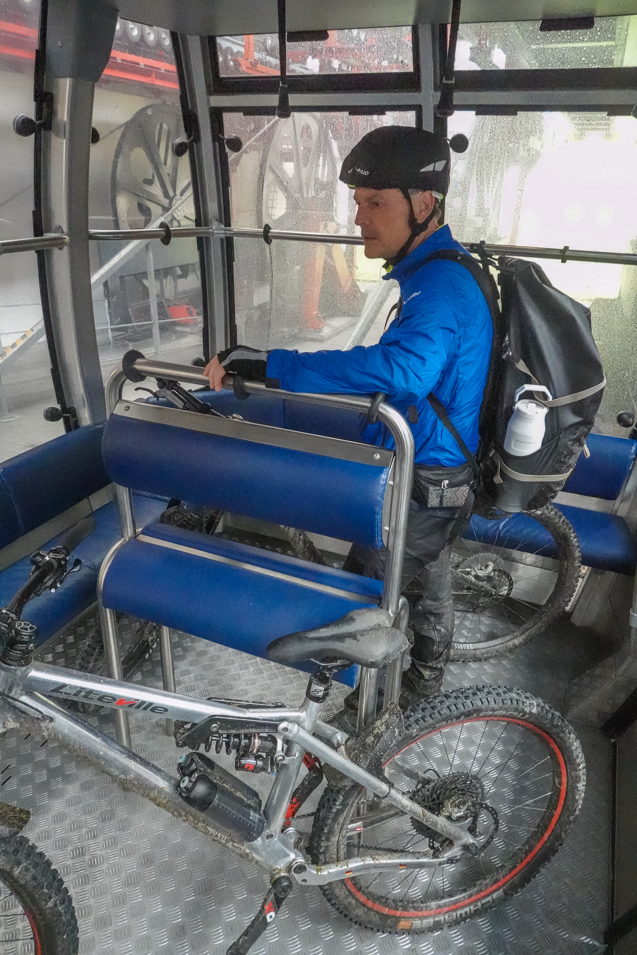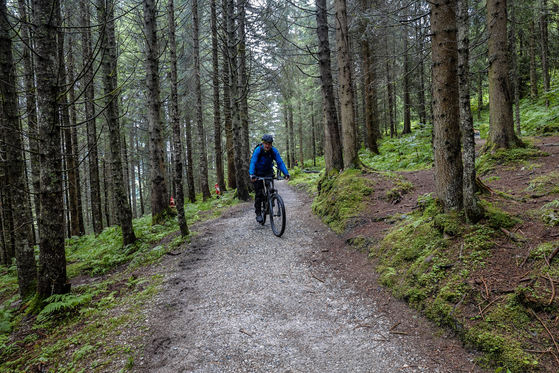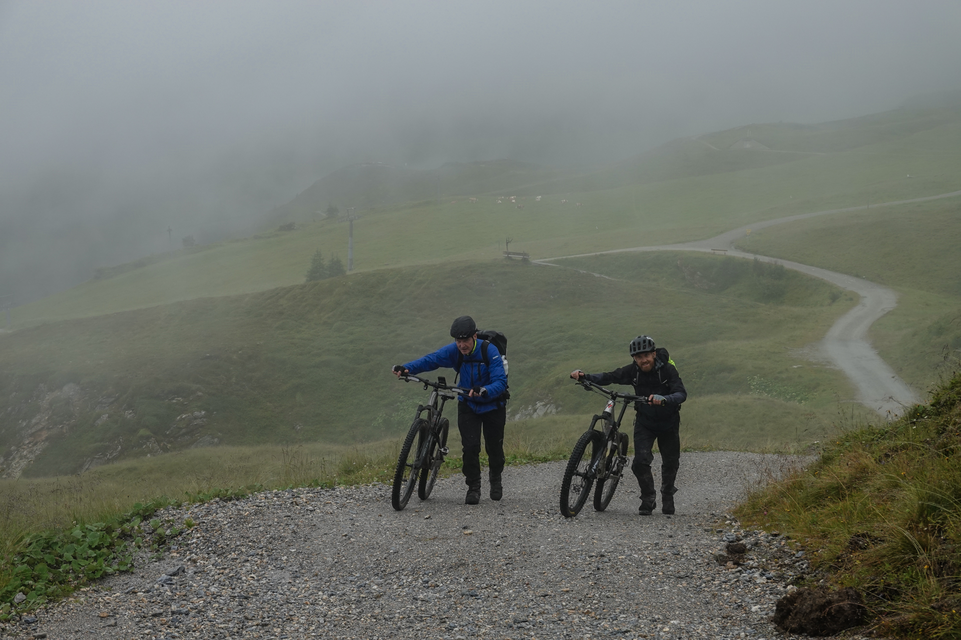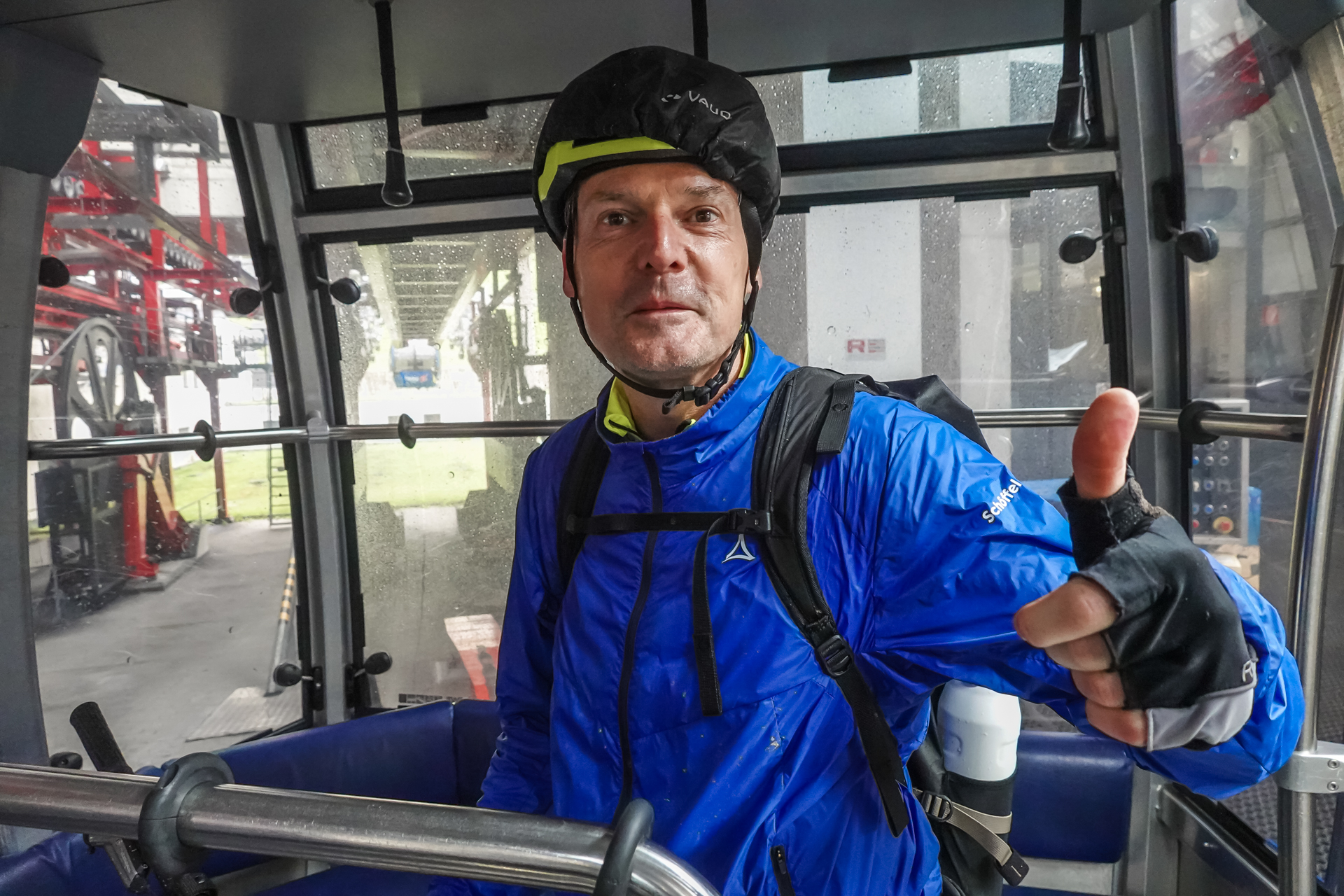 Von dort bringt uns die Seilbahn bequem auf eine Höhe von 1.550 Metern. In einem Bergrestaurant stärken wir uns mit Spaghetti Bolognese, alkoholfreiem Weizenbier und einem Espresso – eine willkommene Pause. Danach geht es wieder zu Fuß weiter: Auf nur 2,5 Kilometern überwinden wir 310 Höhenmeter. Aufgrund der Steilheit bleibt uns nichts anderes übrig, als die Bikes zu schieben. Der leichte Nieselregen wird allmählich schwächer.