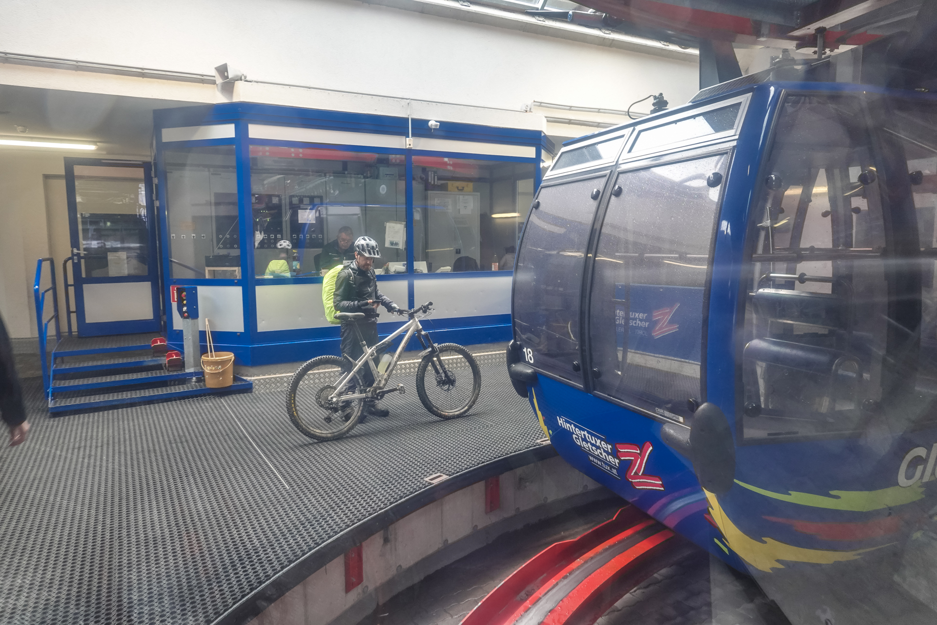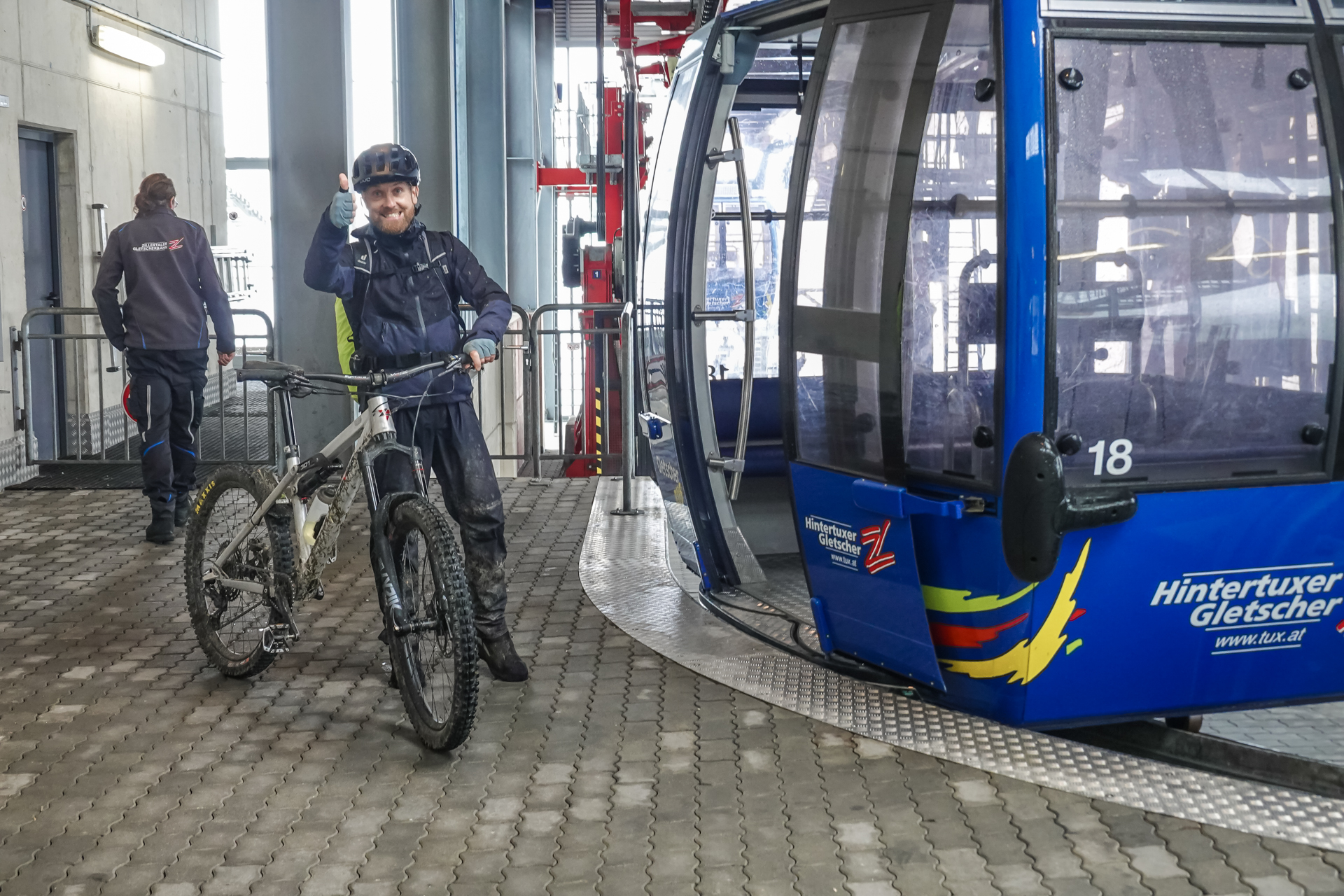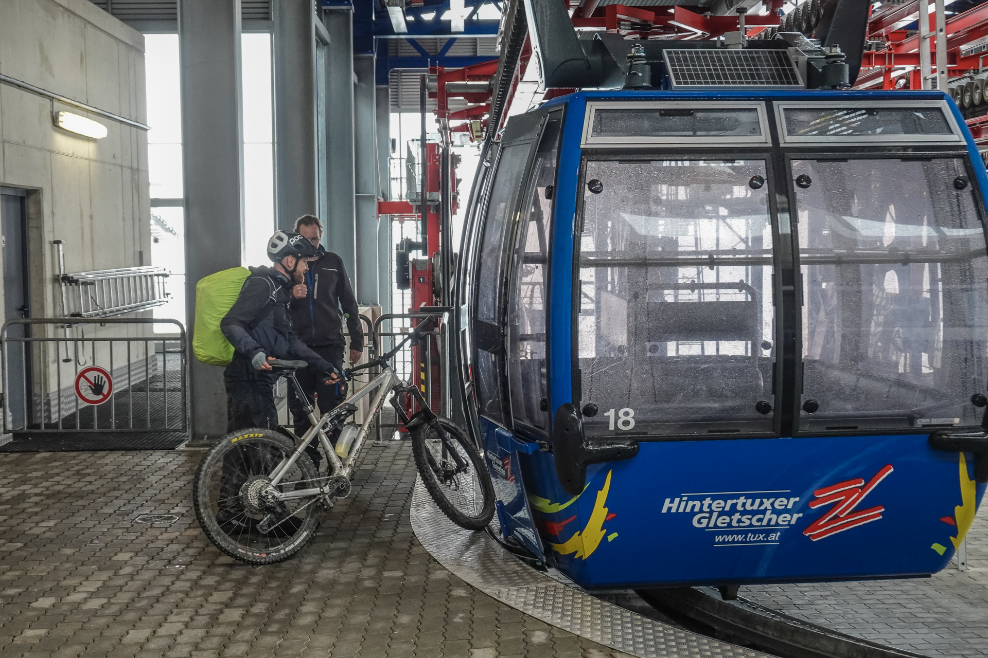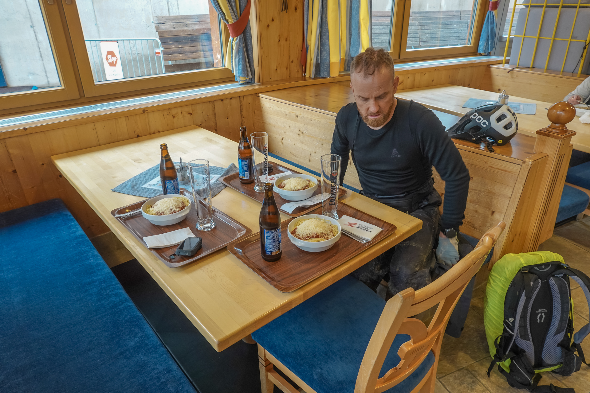 Von dort bringt uns die Seilbahn bequem auf eine Höhe von 1.550 Metern. In einem Bergrestaurant stärken wir uns mit Spaghetti Bolognese, alkoholfreiem Weizenbier und einem Espresso – eine willkommene Pause. Danach geht es wieder zu Fuß weiter: Auf nur 2,5 Kilometern überwinden wir 310 Höhenmeter. Aufgrund der Steilheit bleibt uns nichts anderes übrig, als die Bikes zu schieben. Der leichte Nieselregen wird allmählich schwächer.