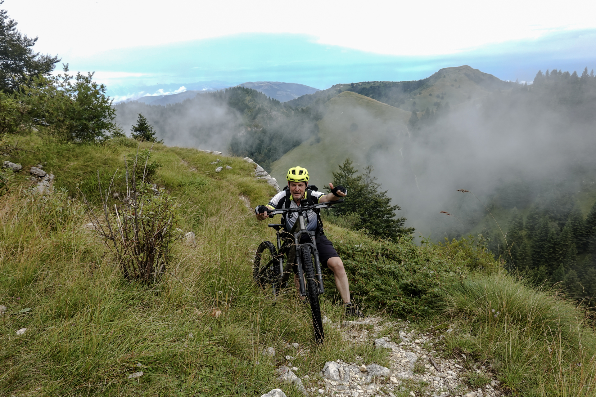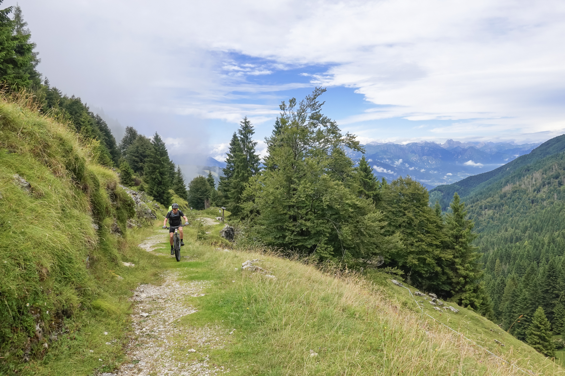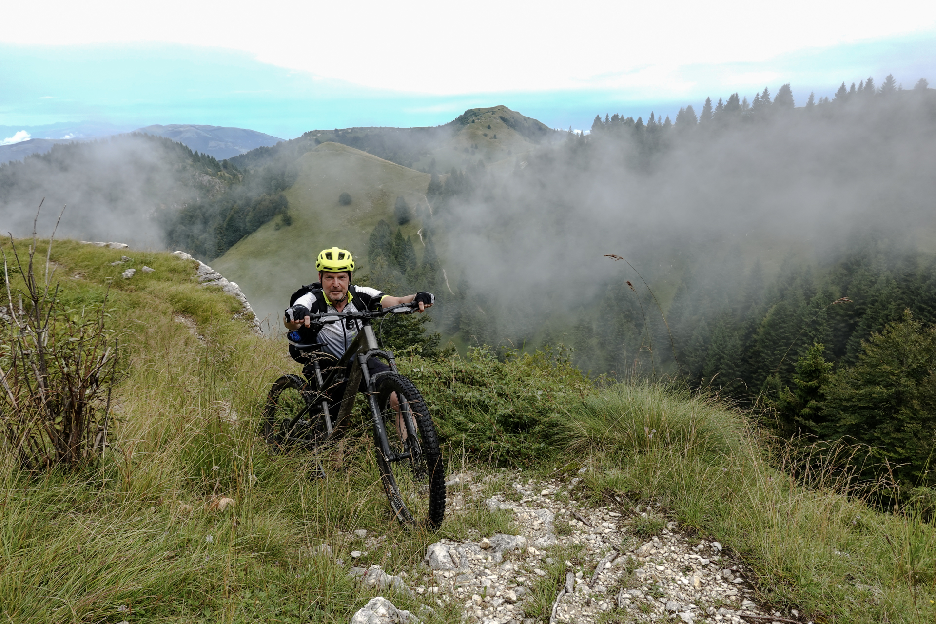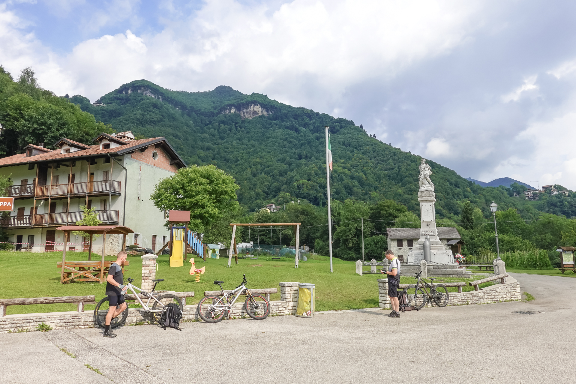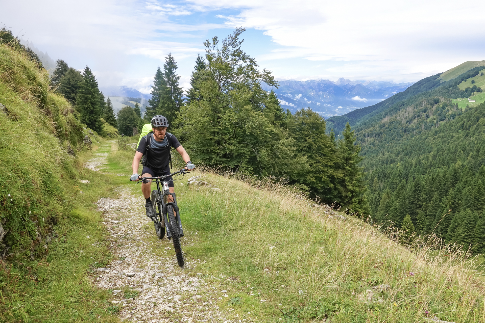 Nach einer ausgiebigen Fotosession begann die letzte Abfahrt unseres Alpencross: ein alter Militärweg, der sich traumhaft über viele Serpentinen ins Tal schlängelte – mal flowig, mal technisch, stellenweise grober Schotter, und stets begleitet von grandiosen Ausblicken. Wow. Unten angekommen, rollten wir die letzten zehn Kilometer durch kleine Dörfer, gönnten uns ein selbstgemachtes Eis in einer typisch Italienischen Eisdiele und radelten weiter bis ins historische Zentrum von Bassano del Grappa.