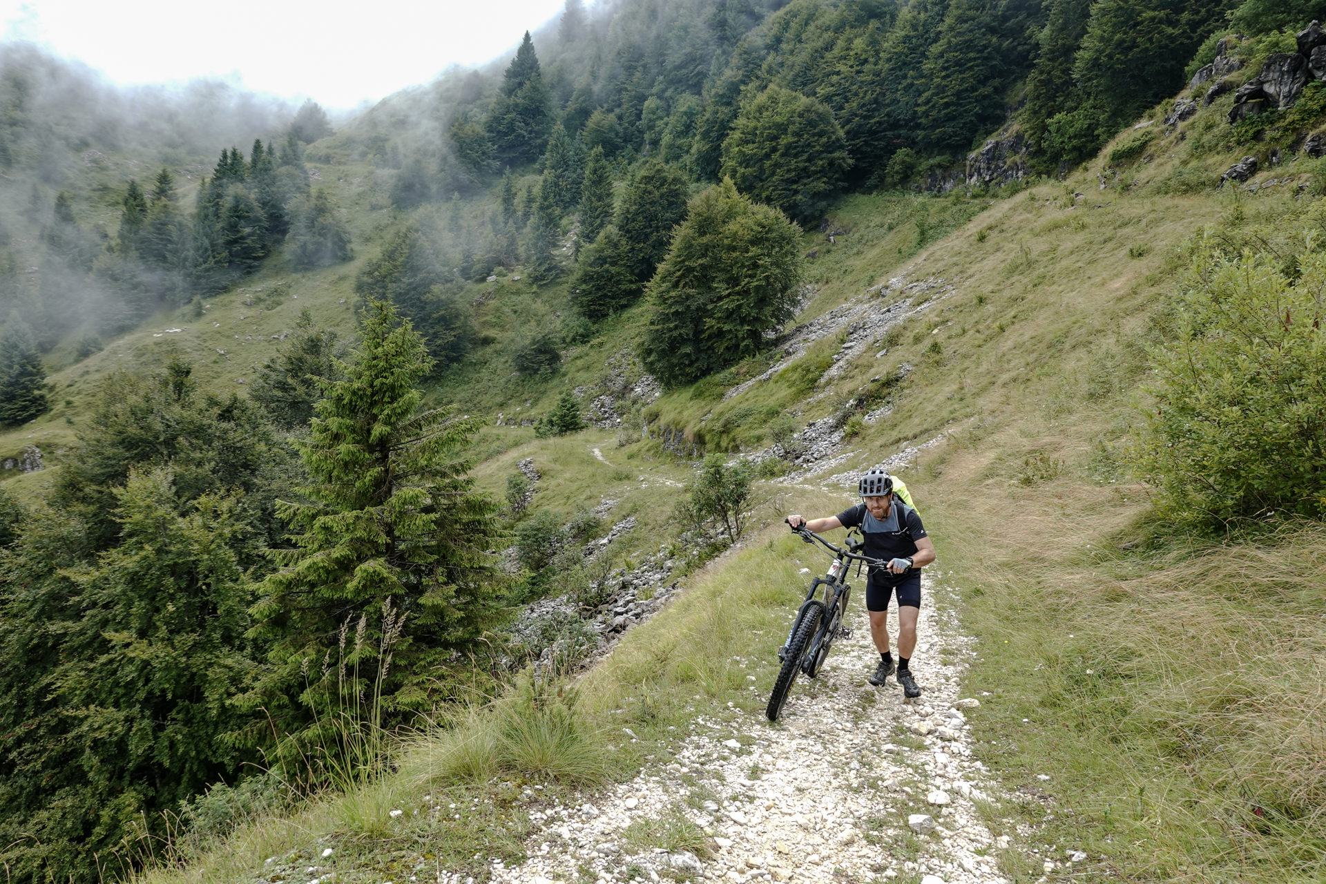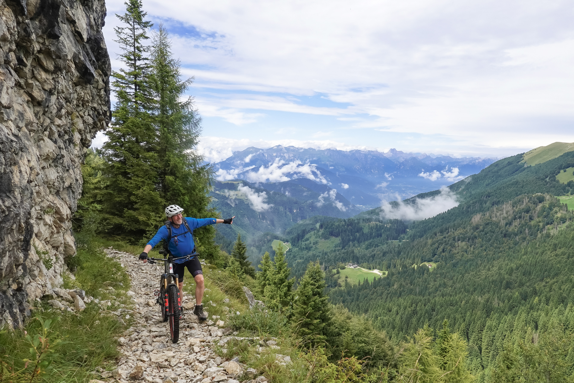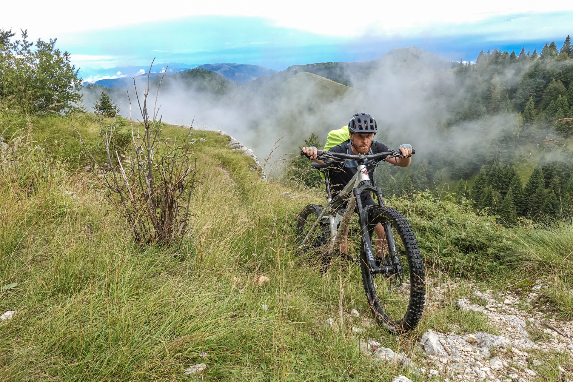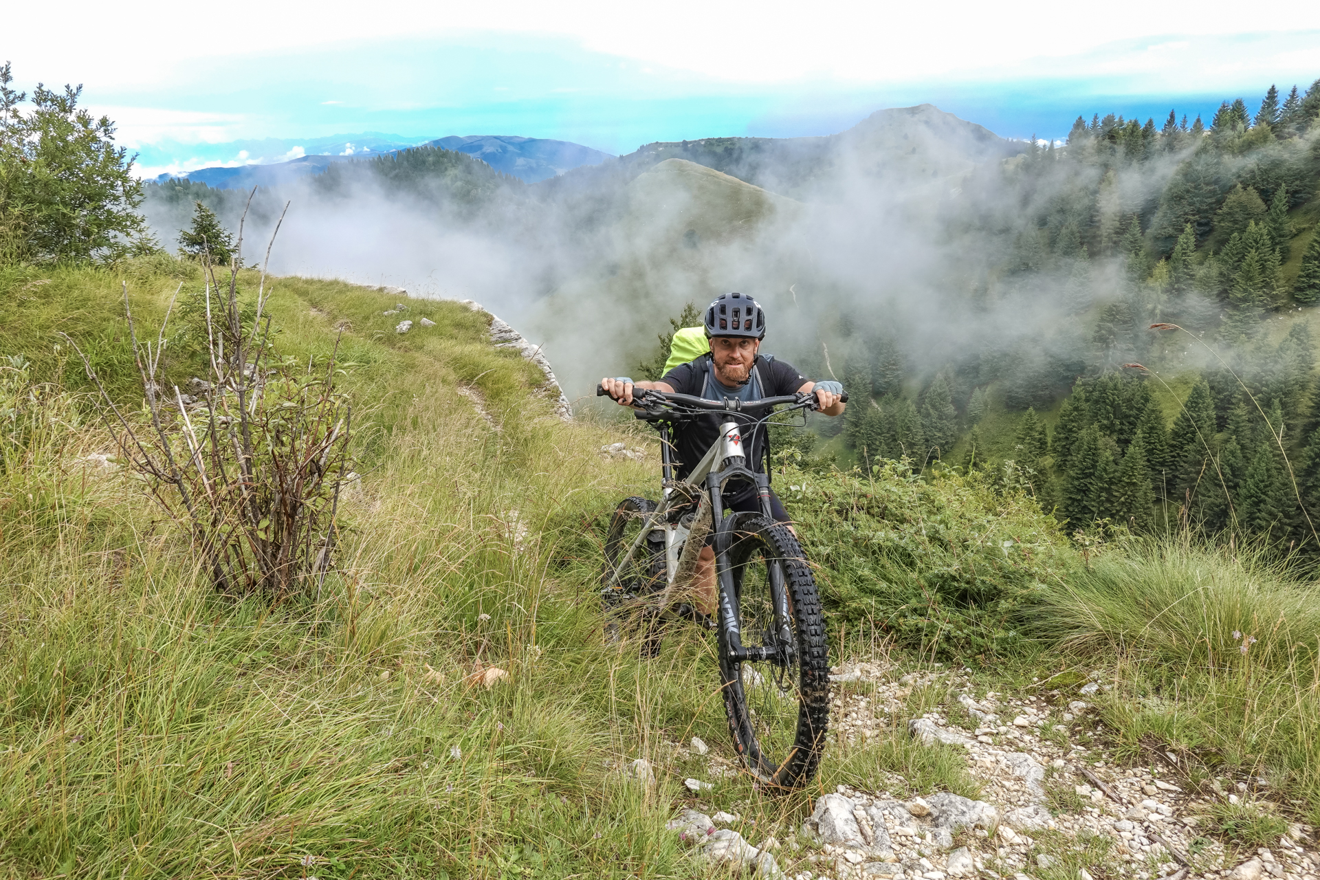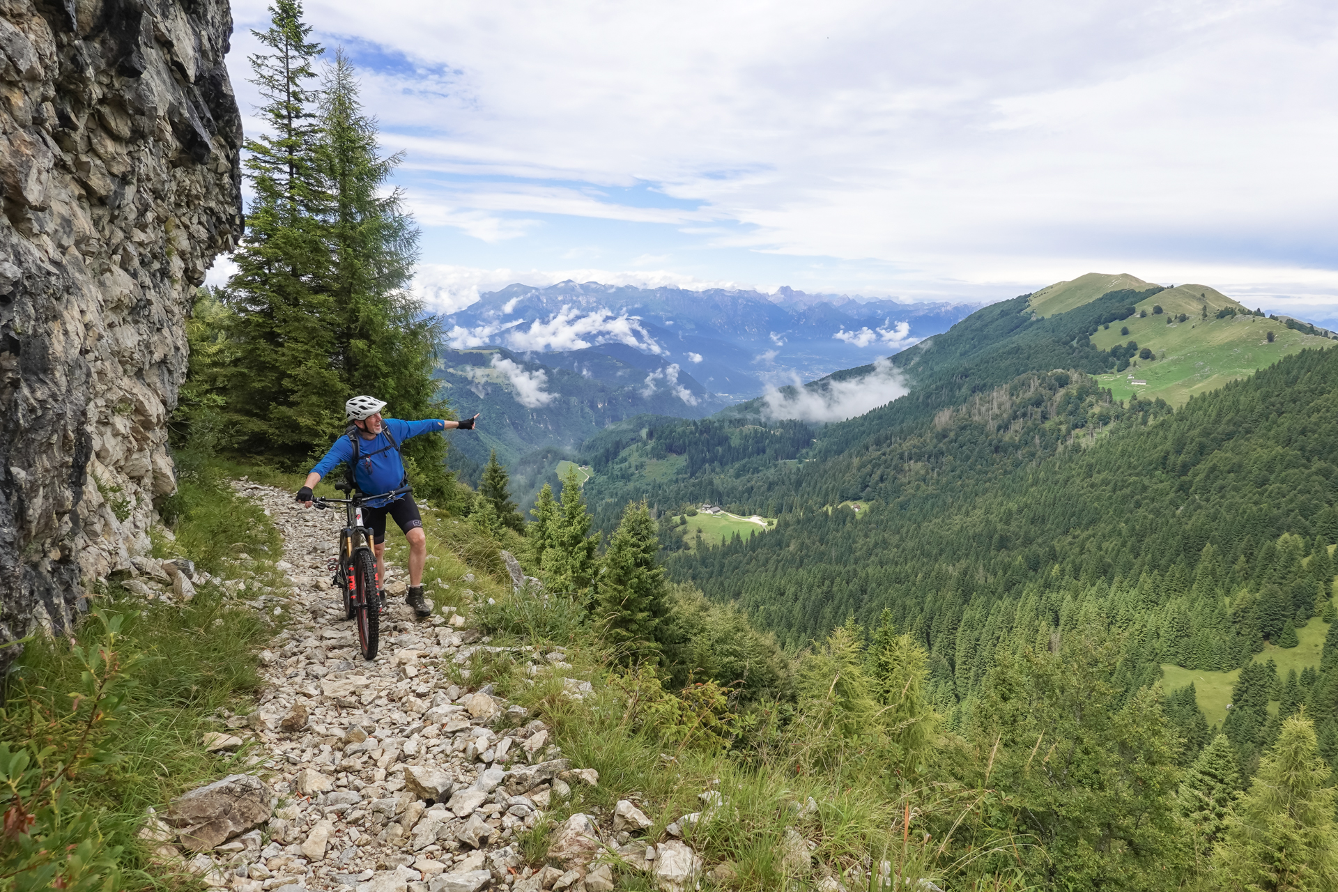 Nach einer ausgiebigen Fotosession begann die letzte Abfahrt unseres Alpencross: ein alter Militärweg, der sich traumhaft über viele Serpentinen ins Tal schlängelte – mal flowig, mal technisch, stellenweise grober Schotter, und stets begleitet von grandiosen Ausblicken. Wow. Unten angekommen, rollten wir die letzten zehn Kilometer durch kleine Dörfer, gönnten uns ein selbstgemachtes Eis in einer typisch Italienischen Eisdiele und radelten weiter bis ins historische Zentrum von Bassano del Grappa.