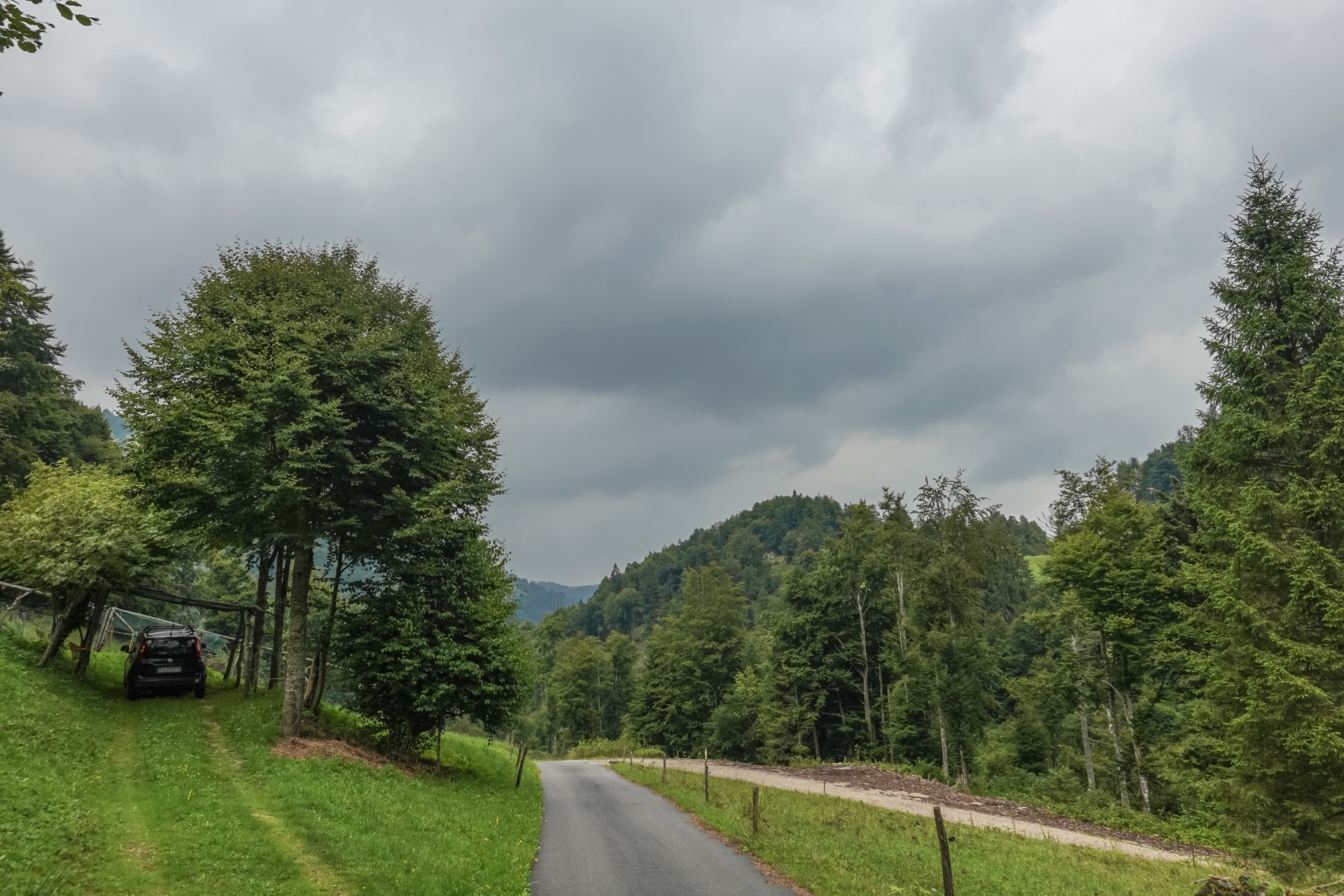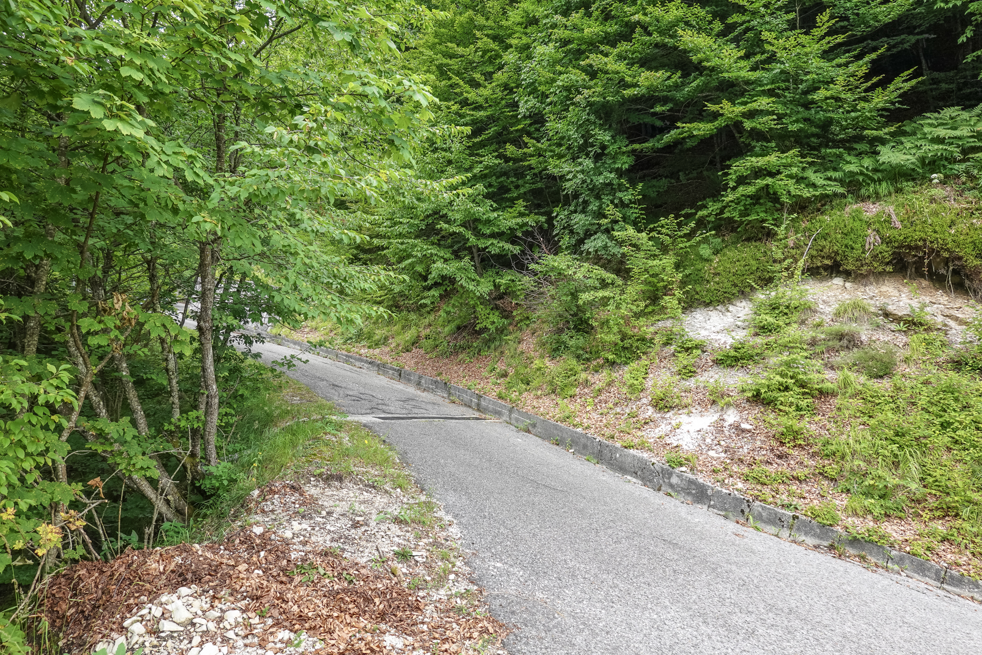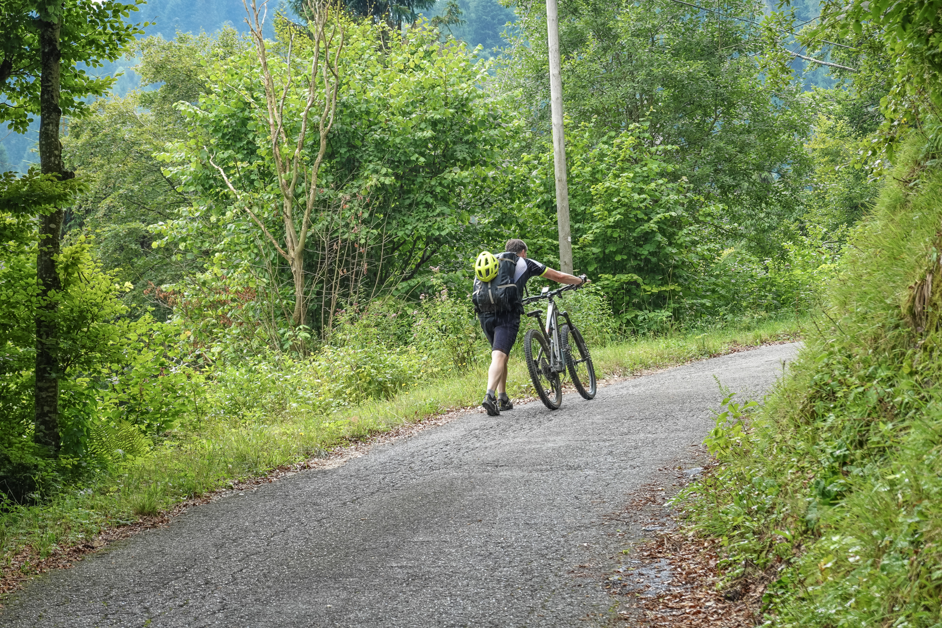 In Pian de la Cesa, einem verschlafenen Ort mit historischem Kriegsdenkmal, füllten wir am Dorfbrunnen unsere Wasserflaschen auf. Kaum wieder im Sattel, wartete der erste richtige Hammer: fast ein Kilometer mit über 22 % Steigung. Die Beine brannten, der Himmel verdunkelte sich zunehmend, und bald begann es zu tröpfeln. Erste Donnerschläge hallten durch das Tal. Wir hielten kurz an, zogen Regenklamotten über und setzten den Anstieg fort – immer höher, ohne jede Möglichkeit, die Beine zwischendurch zu entlasten.