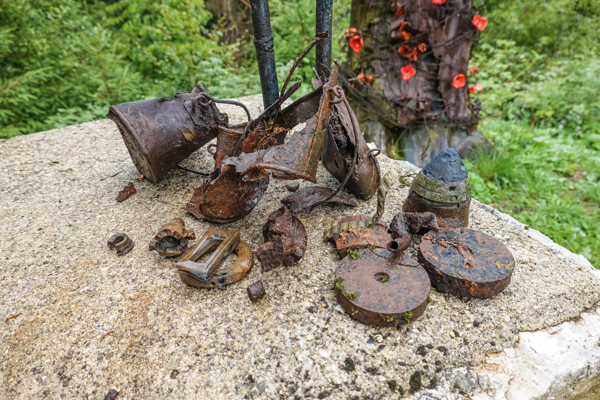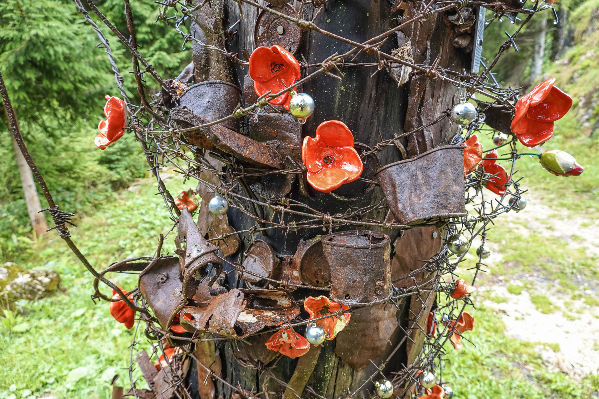 Die Weiterfahrt Richtung Gipfel war geschichtsträchtig. Entlang des schmalen Weges reihten sich alte Bunker aus dem Ersten Weltkrieg, und kunstvoll gestaltete Installationen aus historischen Fundstücken gaben dem Ort eine besondere, fast museale Atmosphäre.
