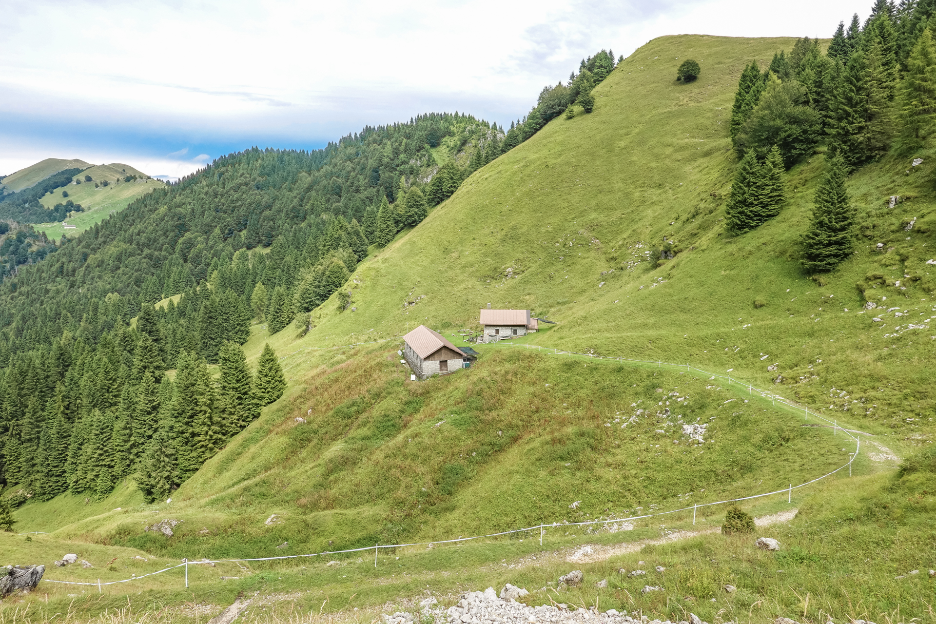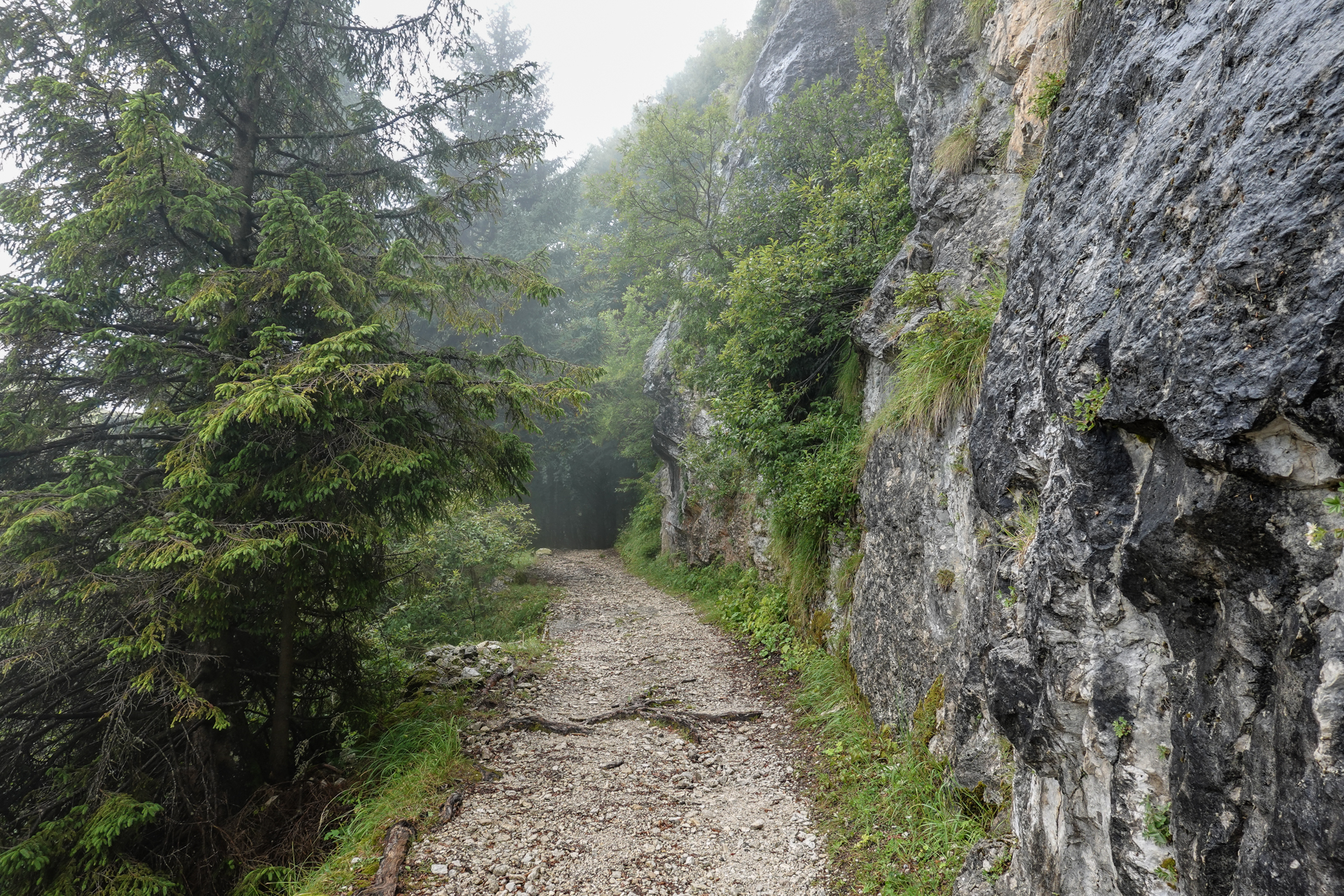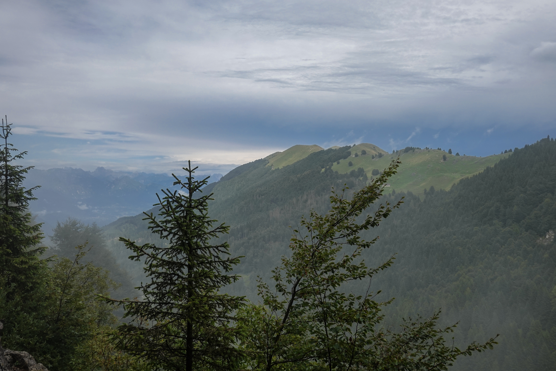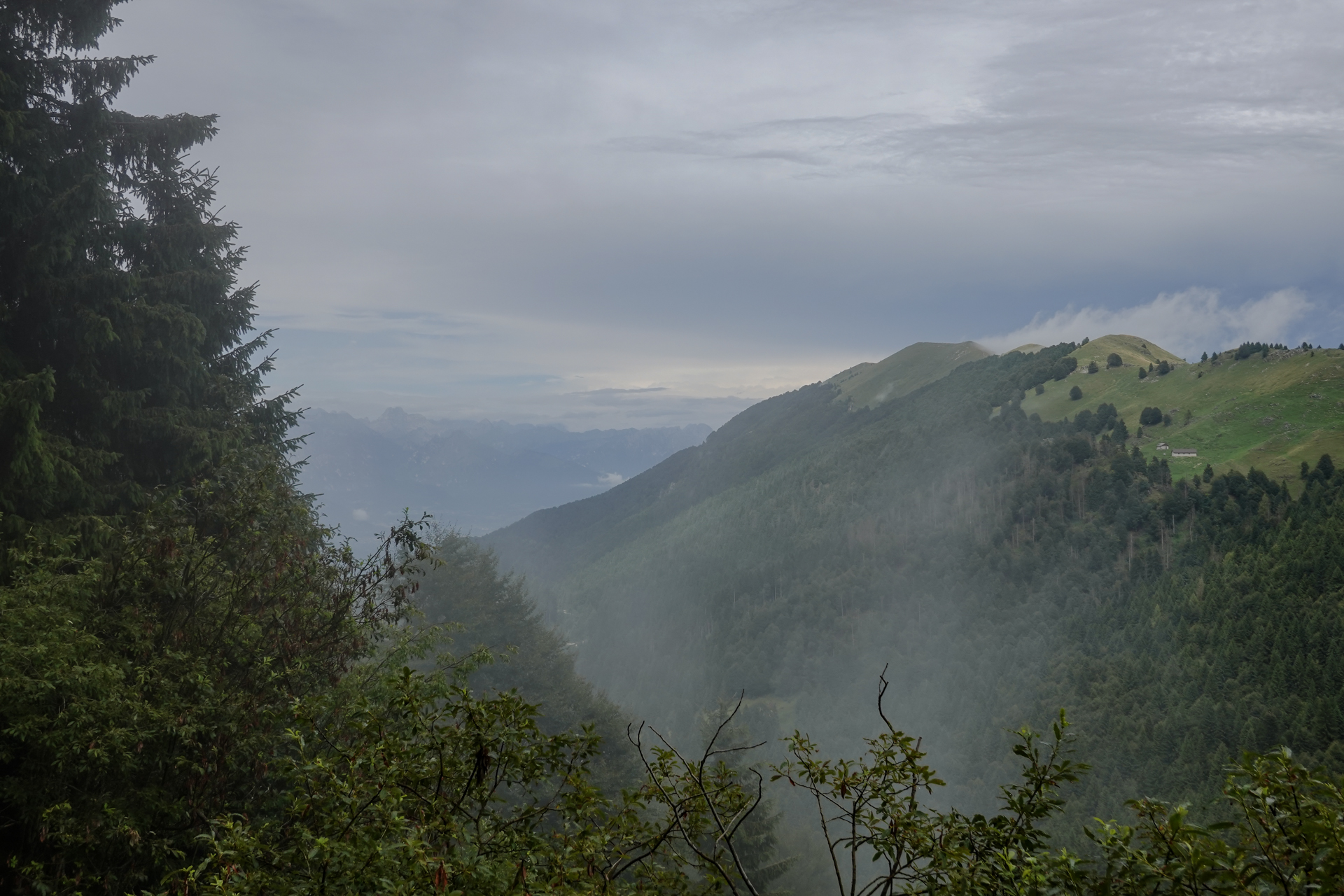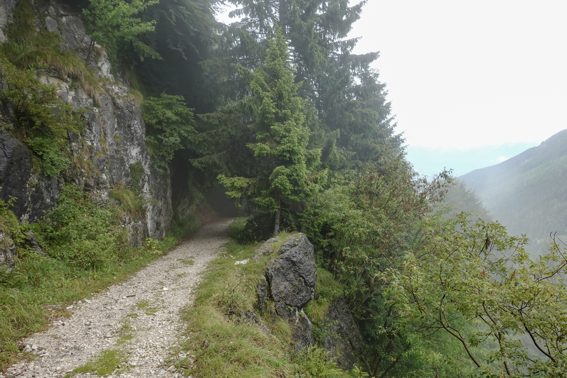 Unser erstes Ziel war das Rifugio Bocchette. Wir erreichten eine weitläufige Wiesenlandschaft – und gleichzeitig entlud sich das Gewitter. Heftiger Regen, grelle Blitze, krachender Donner. Uns wurde mulmig, denn Gewitter in den Bergen sind kein Spaß. Nur noch ein Kilometer bis zur Hütte – also traten wir im Eiltempo an. Klatschnass, aber erleichtert, erreichten wir das Rifugio. Wir waren die einzigen Gäste, bekamen großartiges Essen serviert und wurden herzlich von den Wirtsleuten empfangen. Etwa anderthalb Stunden warteten wir, bis das Unwetter vorbeigezogen war. Genau wie angekündigt, rissen die Wolken auf und die Sonne kehrte zurück.